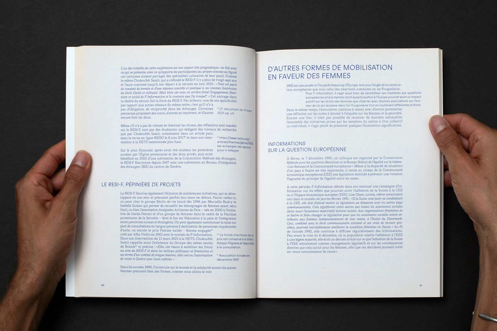 Pour la réalisation de cet ouvrage, nous avons choisi de créer une mise en page dynamique et vivante, à l’image des divers projets menés par F-information pendant ces 40 années. Certaines informations telles que les légendes, sont insérées directement dans les marges au lieu d’être renvoyées en bas de page. Un système de retraits ainsi qu’un changement de caractère typographique viennent rythmer la mise en page et mettre en avant certains passages du livre.