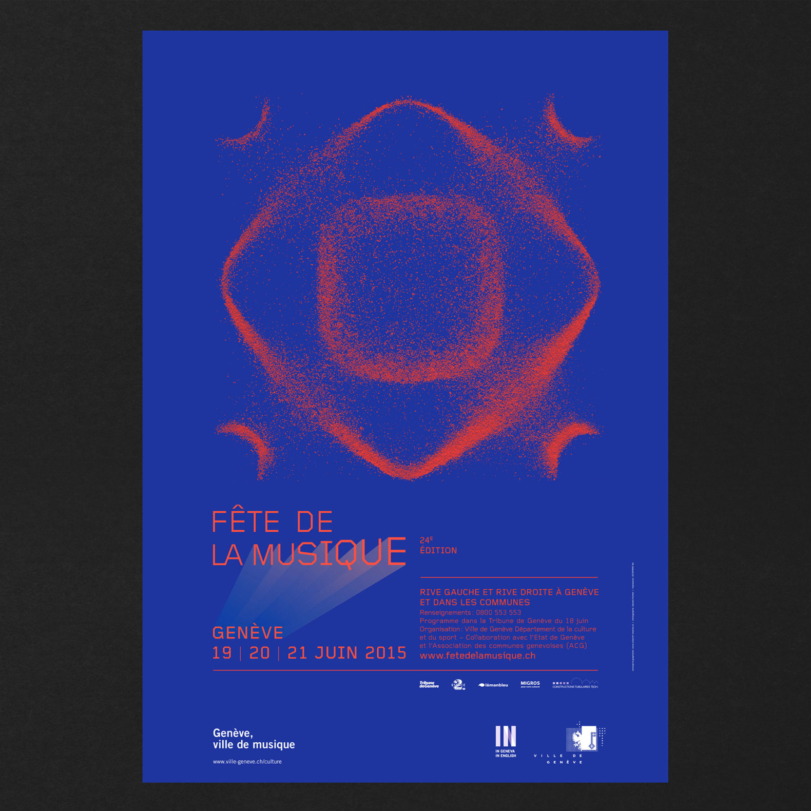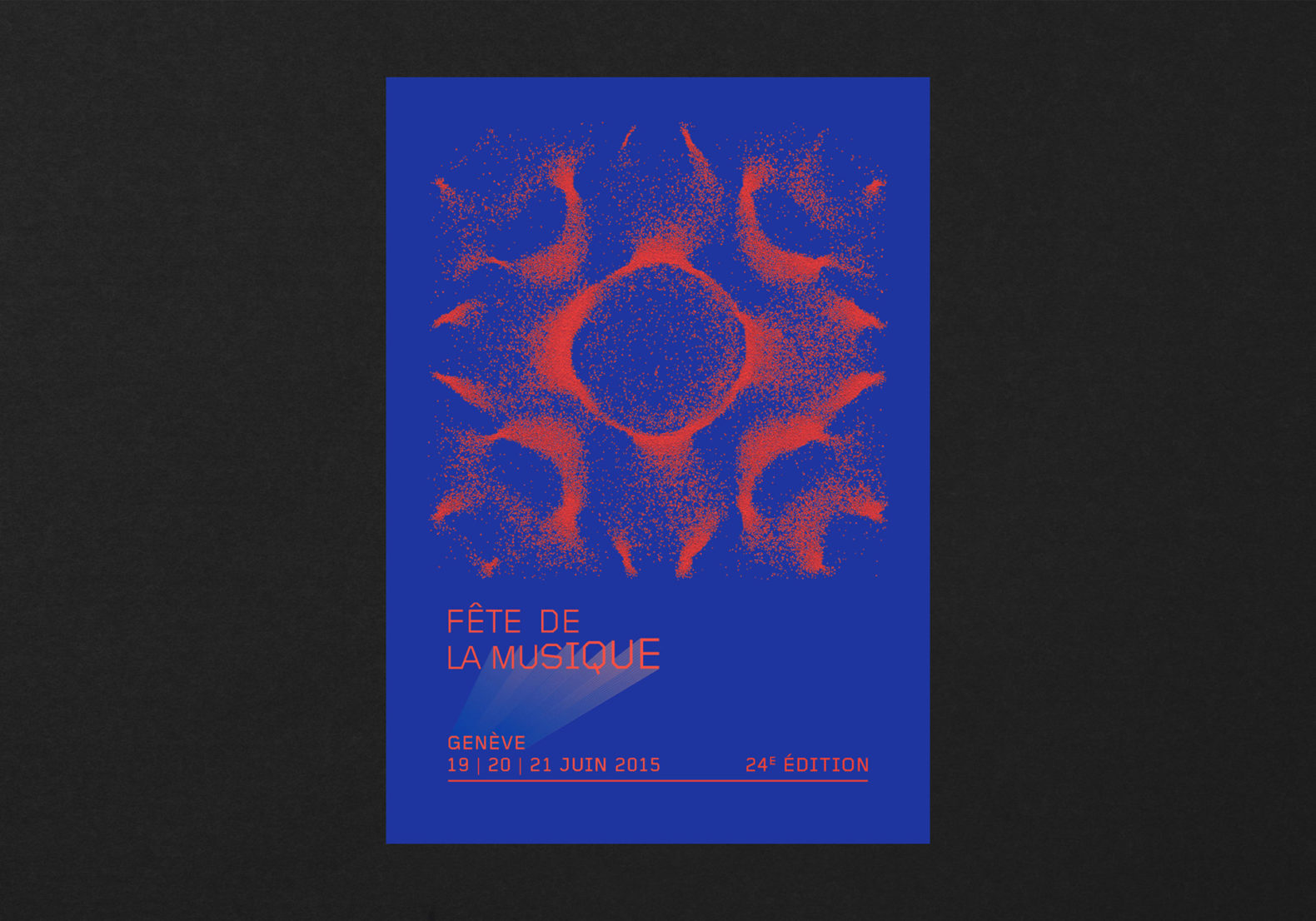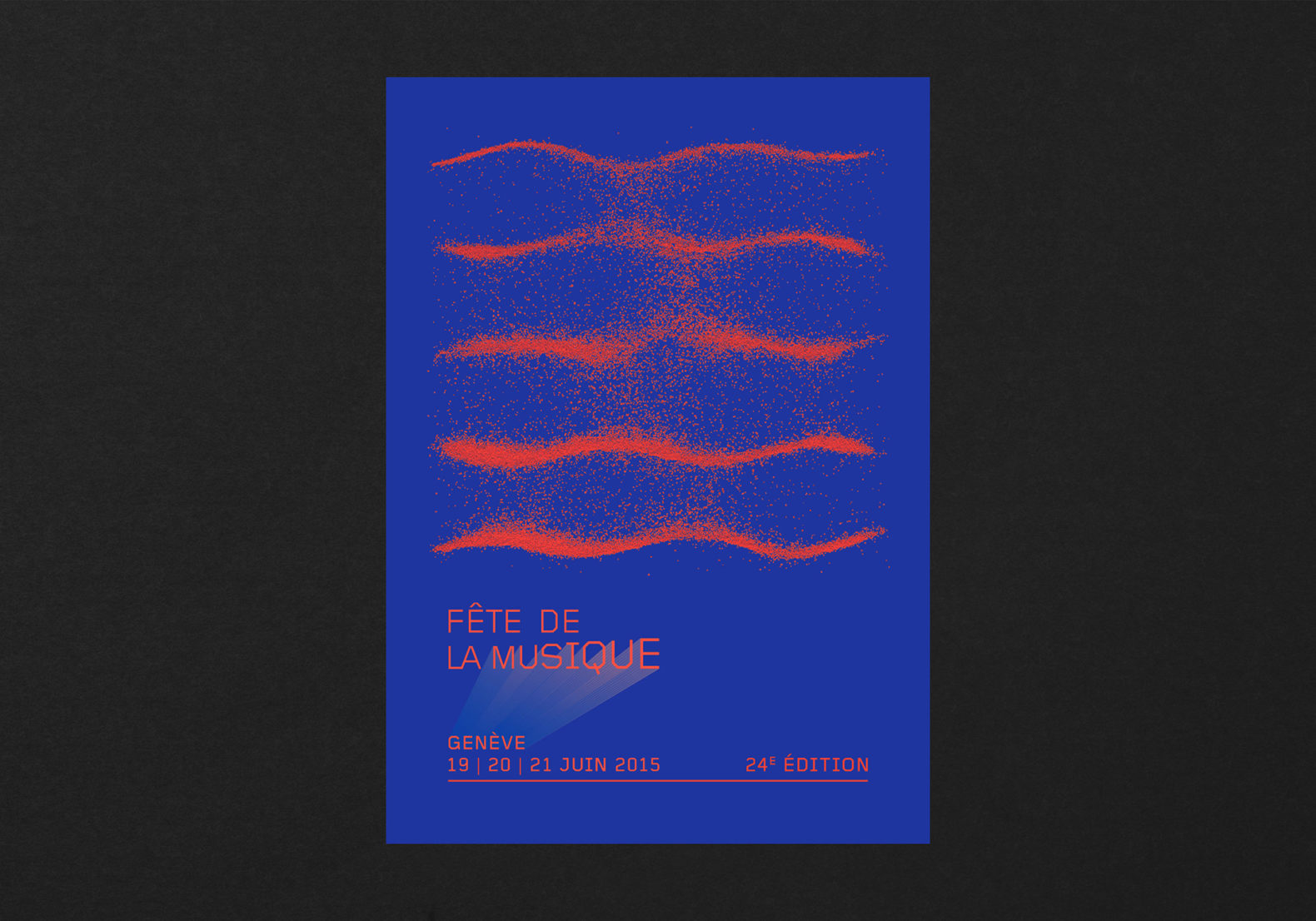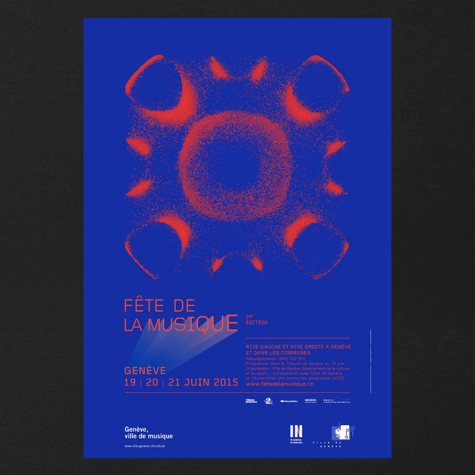 La réalisation de la communication visuelle de la Fête de la musique (Genève) est déclinée sur 3 ans. Nous avons choisi  une approche abstraite pour l’ensemble de la communication visuelle.