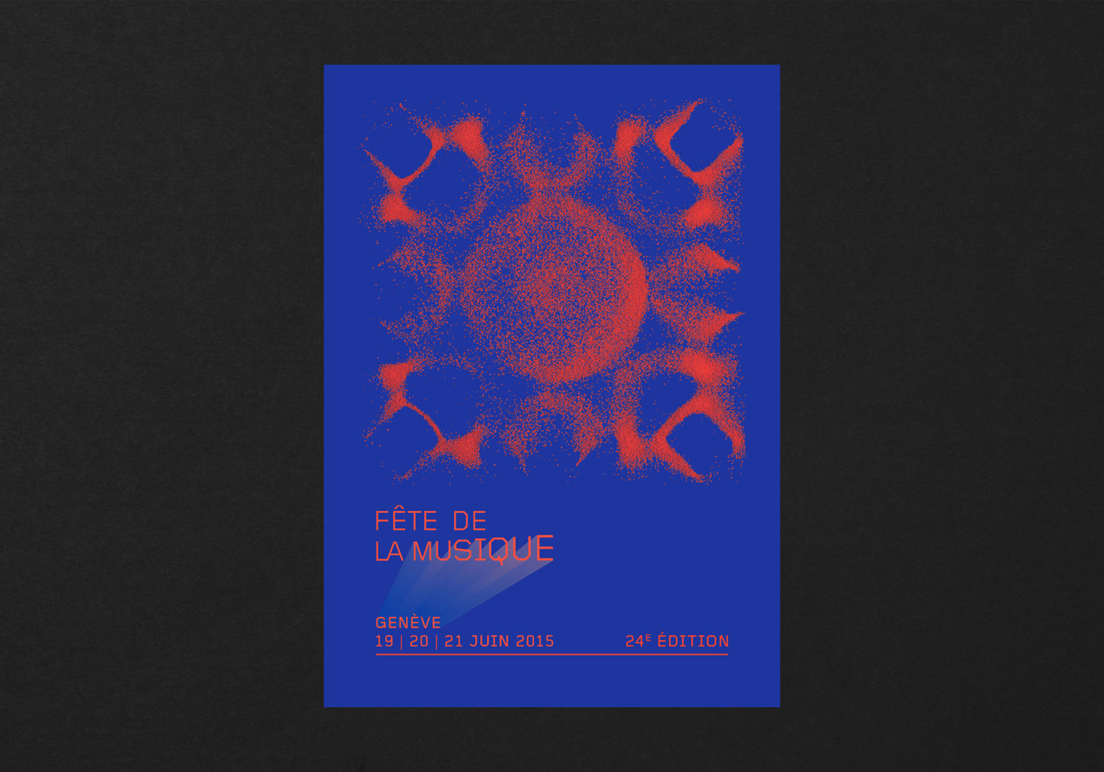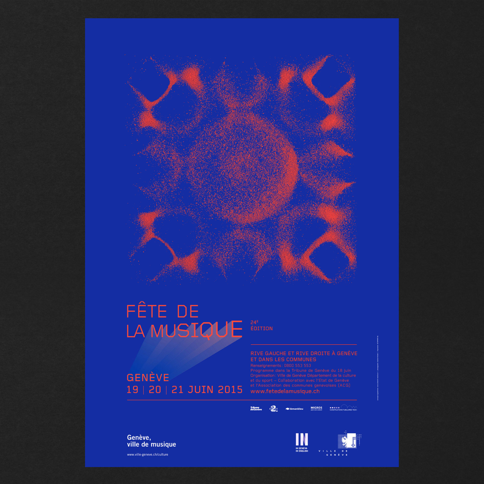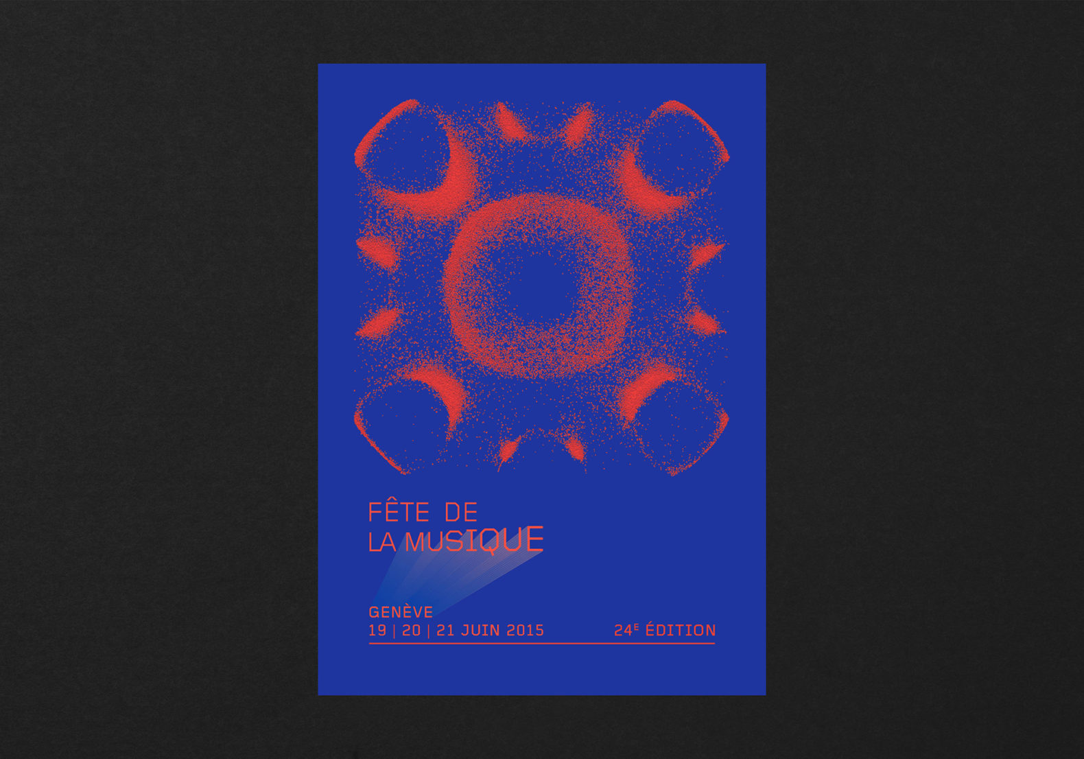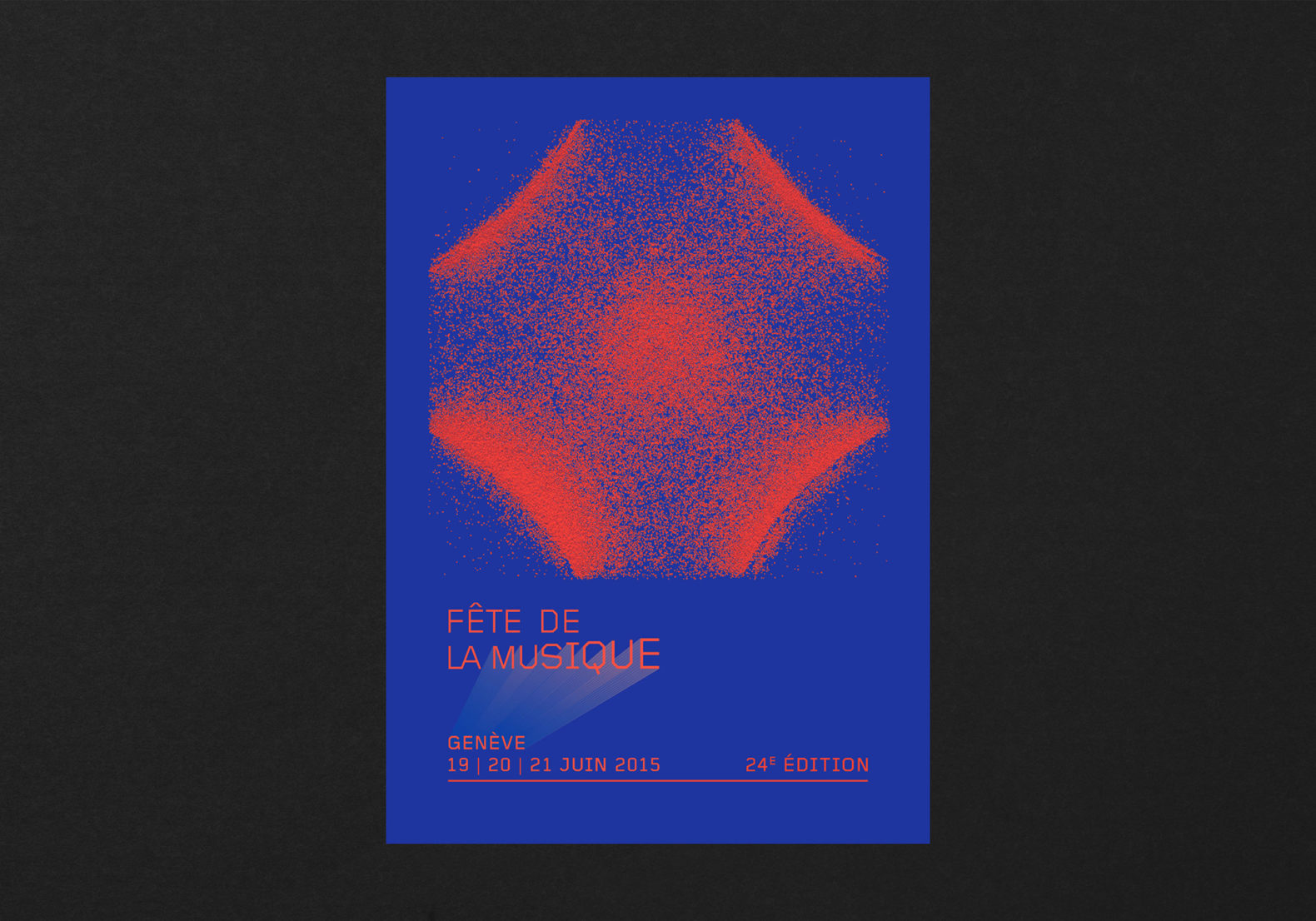 La réalisation de la communication visuelle de la Fête de la musique (Genève) est déclinée sur 3 ans. Nous avons choisi  une approche abstraite pour l’ensemble de la communication visuelle.