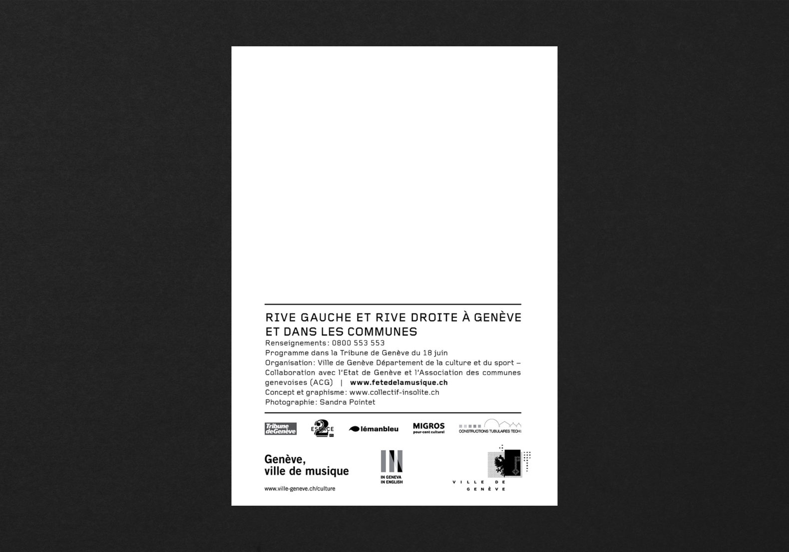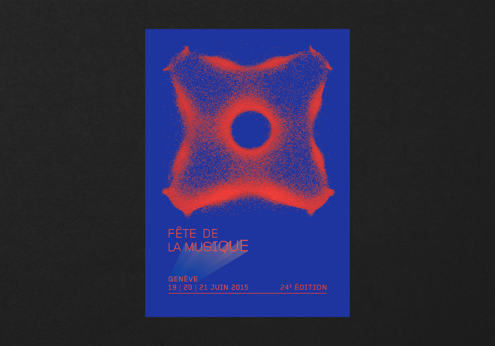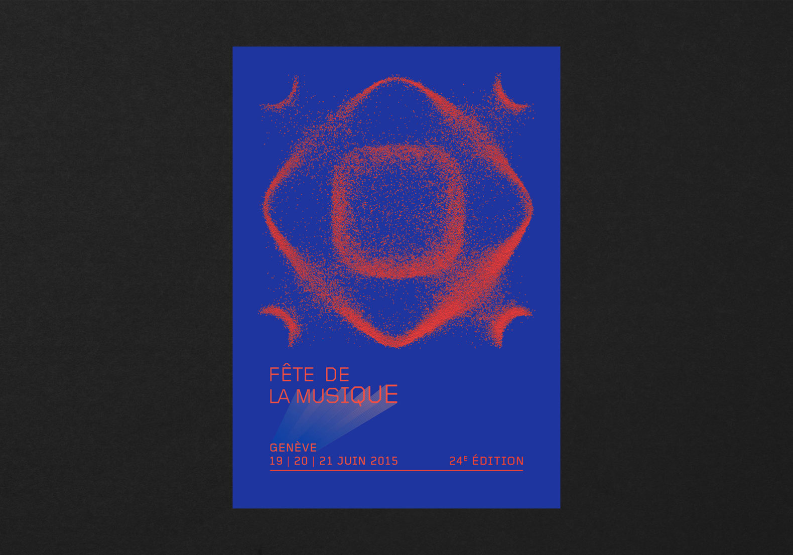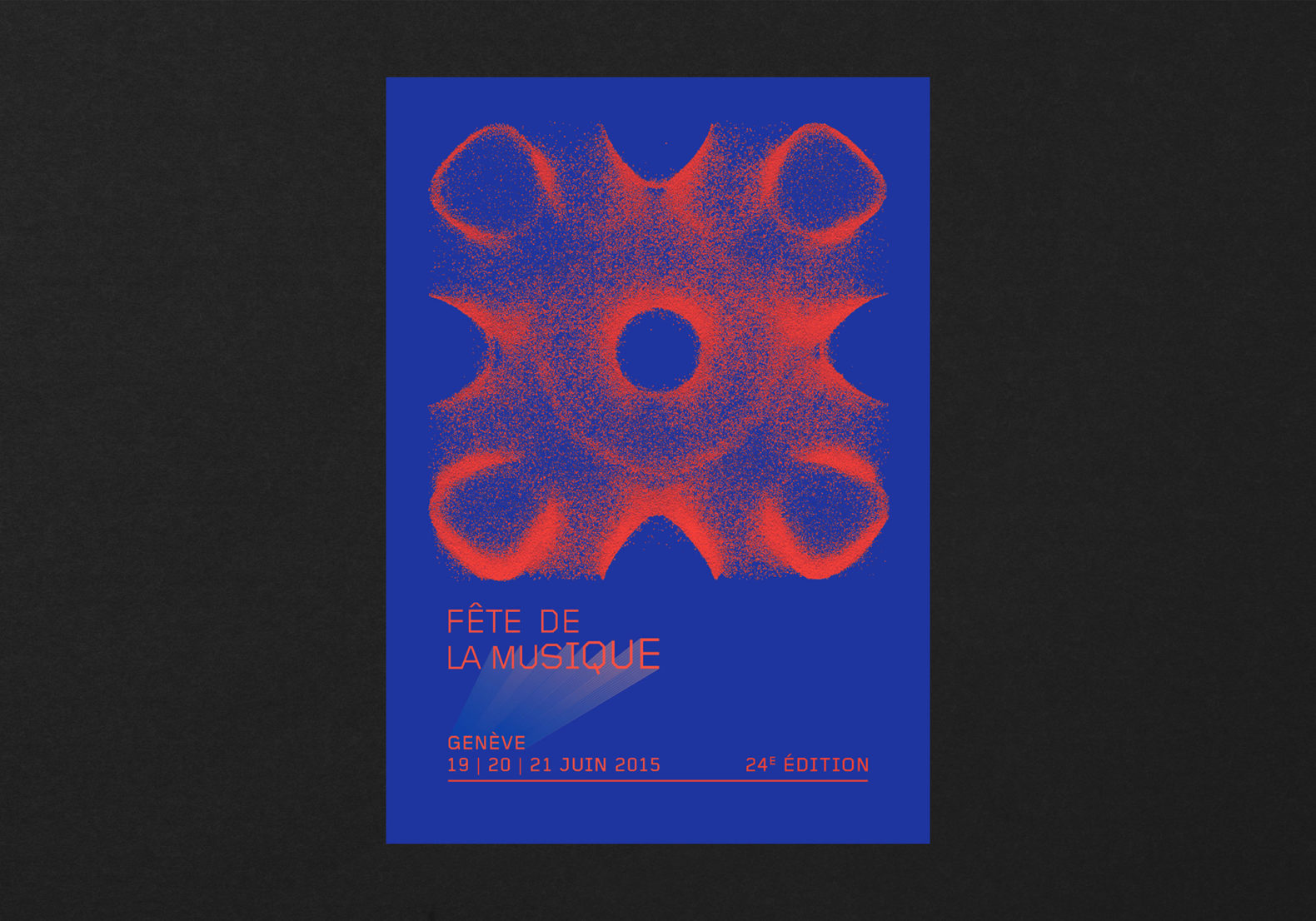 La réalisation de la communication visuelle de la Fête de la musique (Genève) est déclinée sur 3 ans. Nous avons choisi  une approche abstraite pour l’ensemble de la communication visuelle.