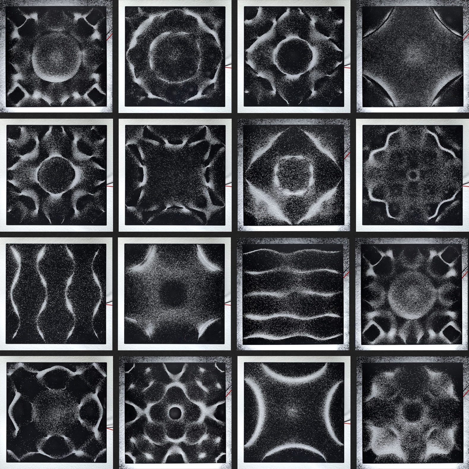 Travailler sur l’aspect abstrait de la musique permet de l’évoquer sous sa forme universelle, impalpable, sans privilégier un style musical. Afin de représenter visuellement les ondes sonores, nous avons fabriqué un dispositif permettant de réaliser les figures de Chladni. Une plaque en aluminium est fixée sur une tige métallique, elle-même vissée sur un vibreur électro-mécanique. En recouvrant la plaque de sel et en la faisant vibrer grâce aux fréquences, nous avons pu créer les figures de Chladni. Nous avons filmé et photographié les transitions de fréquences ainsi que les formes produites par le déplacement des grains de sel sur la plaque.