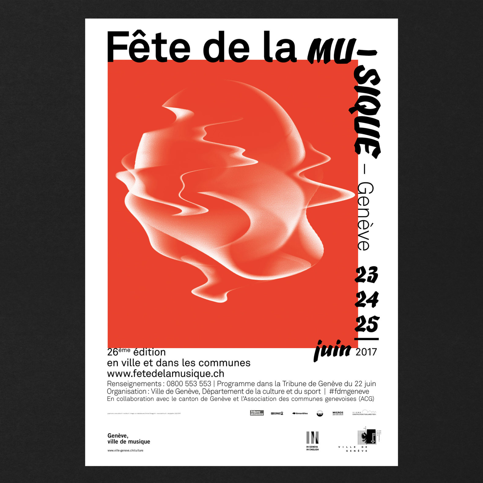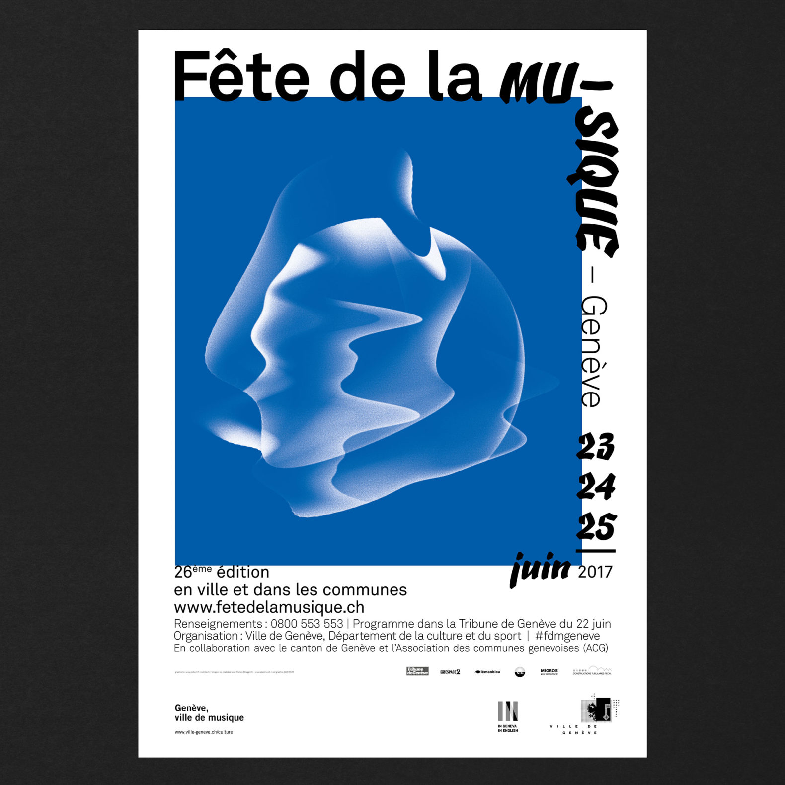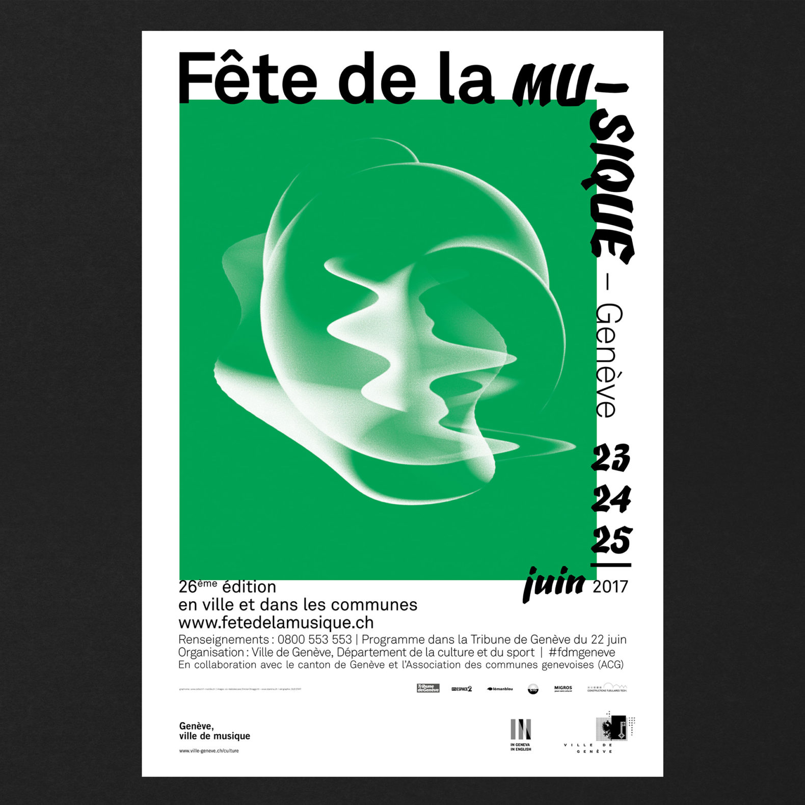 La réalisation de la communication visuelle de la Fête de la musique (Genève) est déclinée sur 3 ans. Nous avons choisi de conserver une approche abstraite pour représenter la musique.