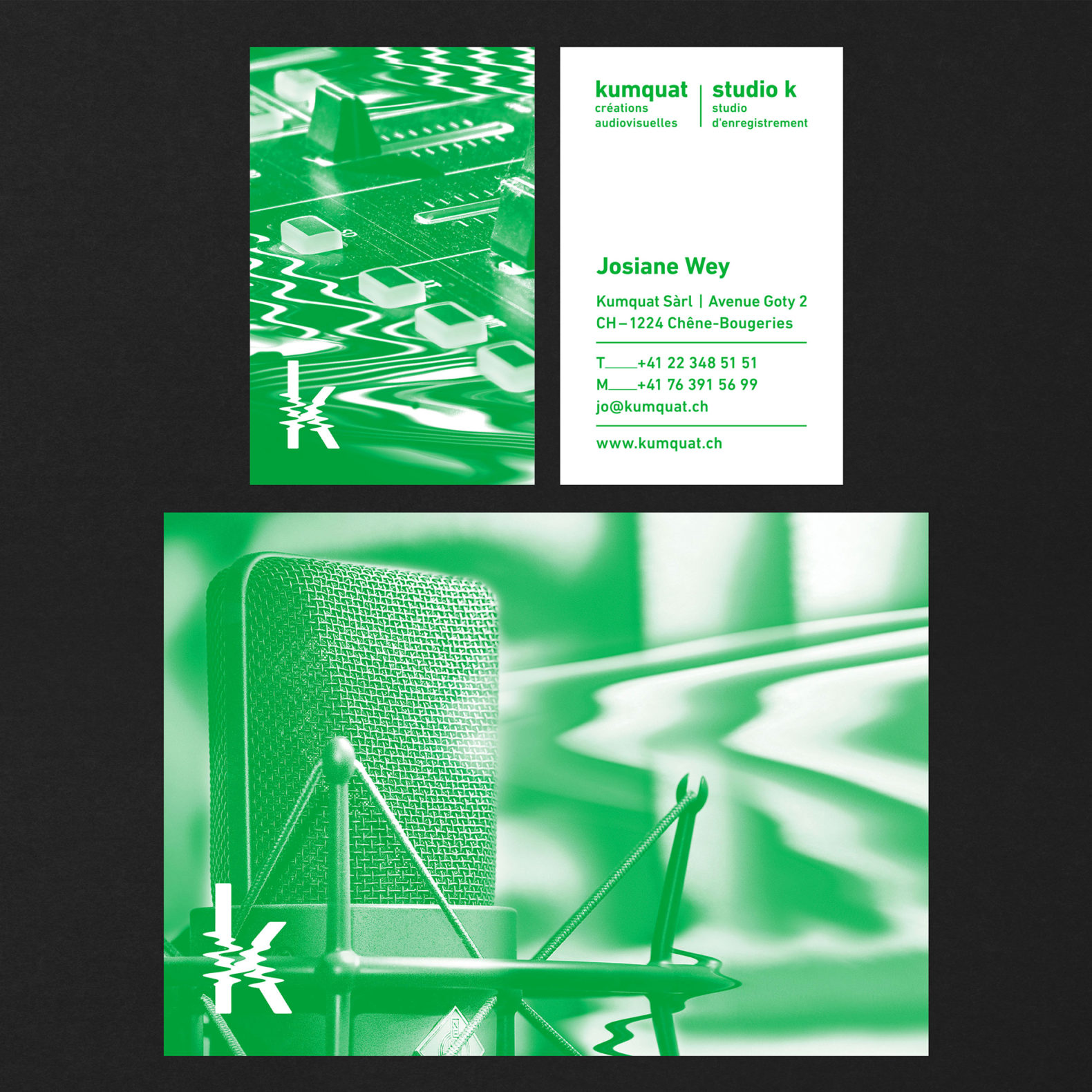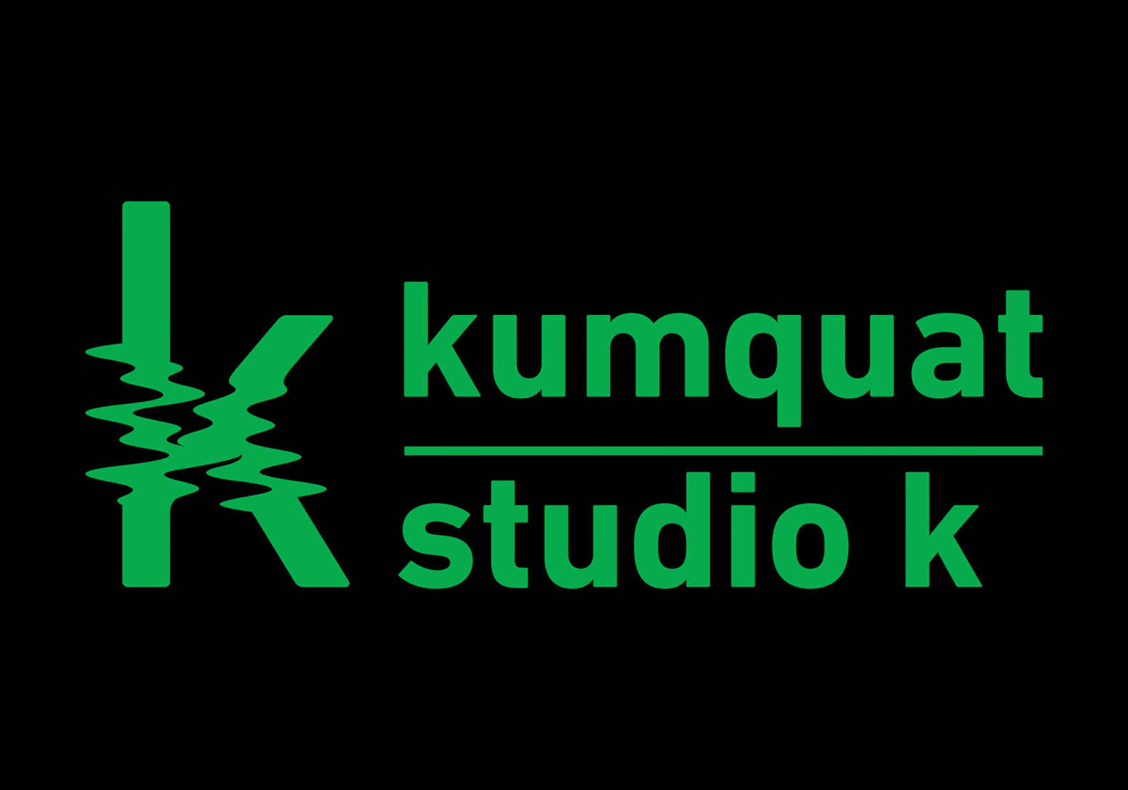 L’idée pour la création de la nouvelle identité visuelle, a été d’utiliser la lettre k (commune au studio k et kumquat) et d’y transposer graphiquement l’image et le son de manière abstraite. La partie centrale de la lettre k comporte des perturbations, des oscillations, rappelant un glitch ou une onde sonore. Les parties non déformées aux extrémités, suggèrent la stabilité et l’ancrage de l’entreprise familiale.