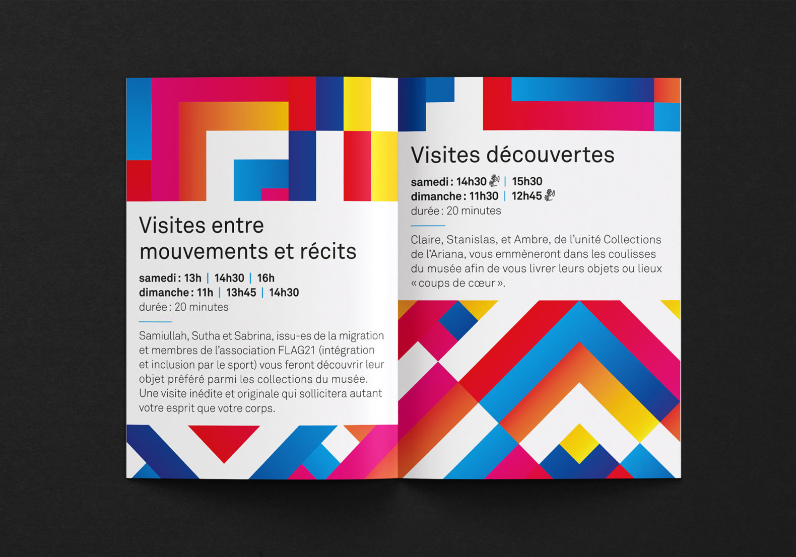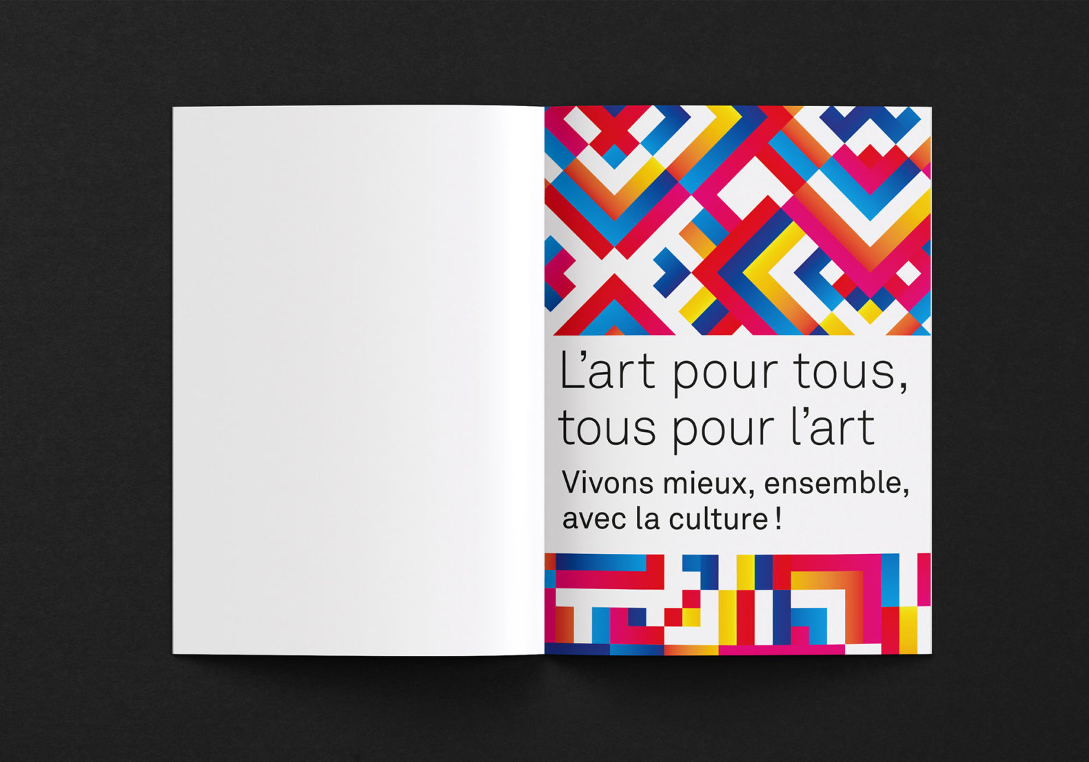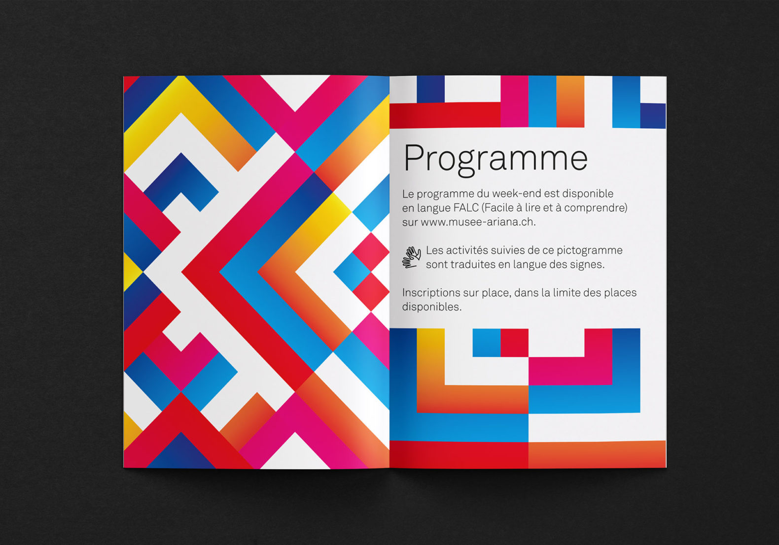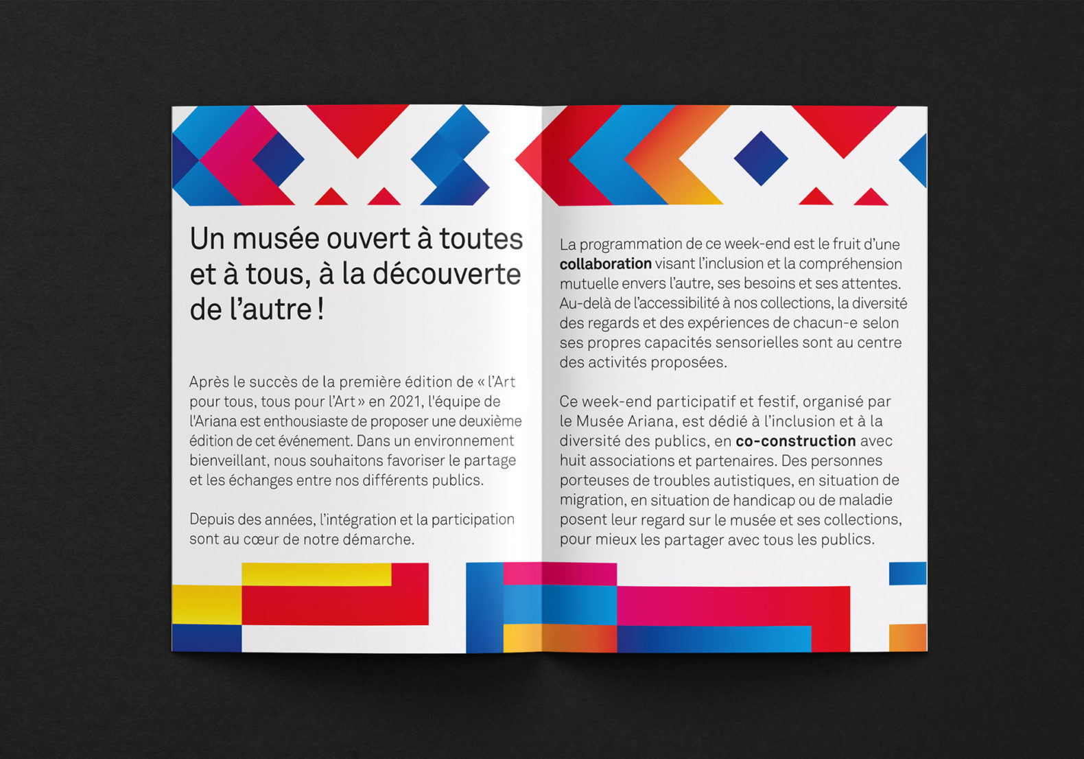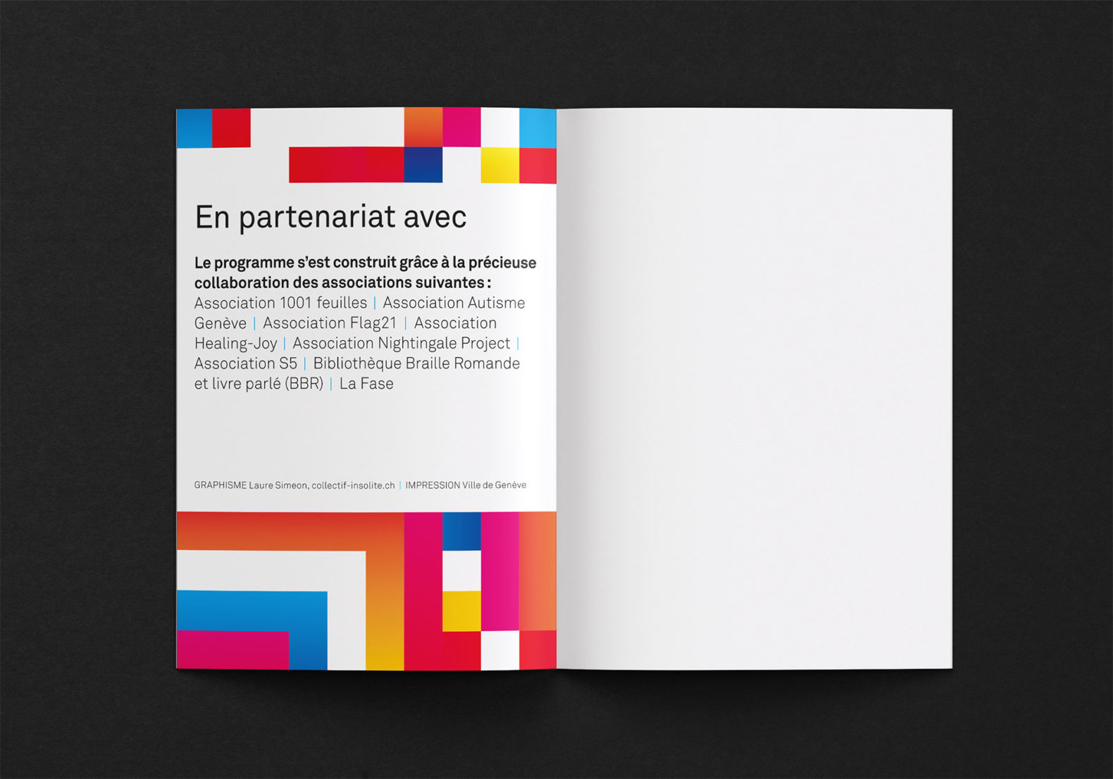 Des formes carrées colorées sont placées, superposées et mélangées de manière à obtenir visuellement un motif abstrait qui symbolise l’esprit de collaboration, la création et l’échange. La mise en page tient compte de certaines contraintes visuelles (pas de superposition texte et image, contrastes élevés, tailles de caractères typographiques élevées, pas de césure, pas d’italique ou de soulignement etc.)