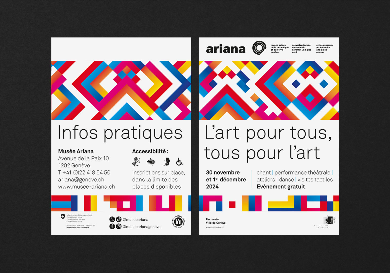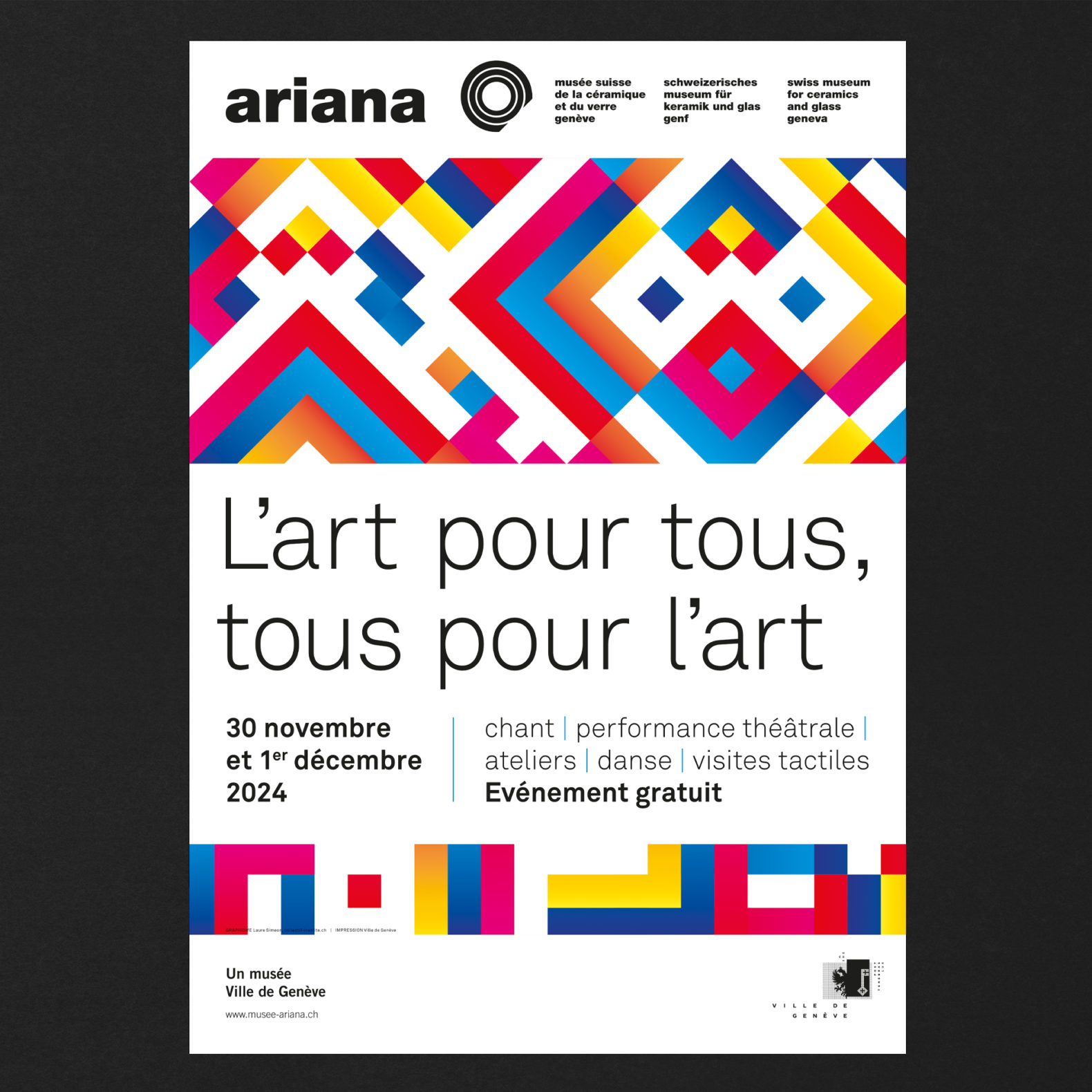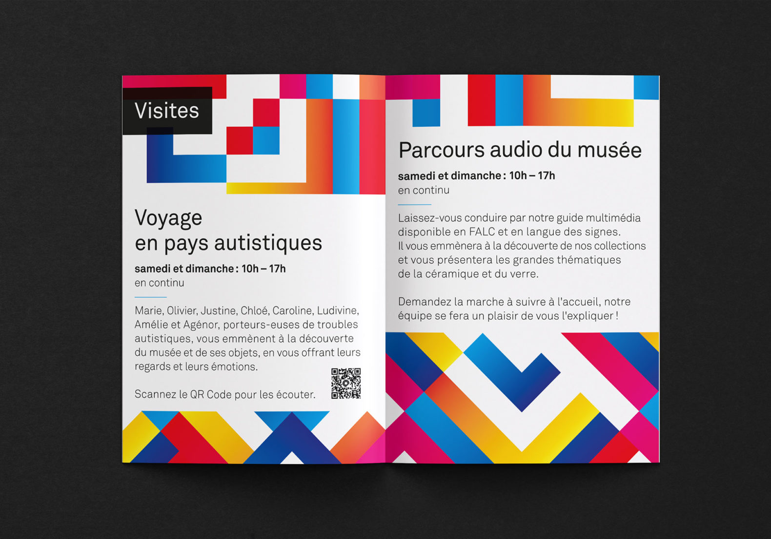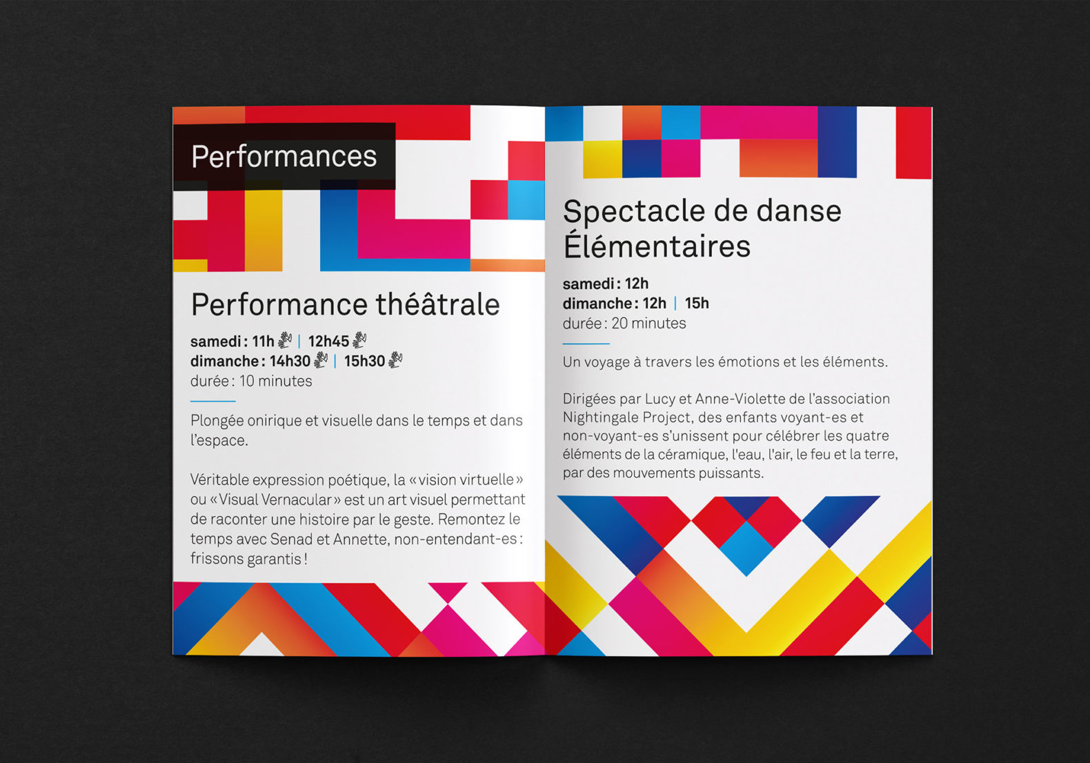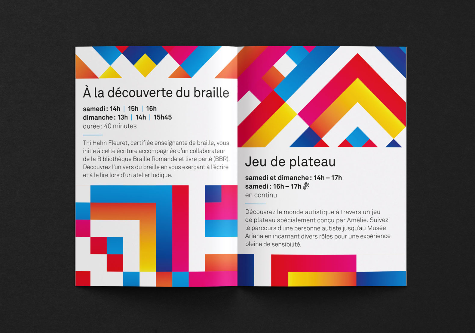 Des formes carrées colorées sont placées, superposées et mélangées de manière à obtenir visuellement un motif abstrait qui symbolise l’esprit de collaboration, la création et l’échange. La mise en page tient compte de certaines contraintes visuelles (pas de superposition texte et image, contrastes élevés, tailles de caractères typographiques élevées, pas de césure, pas d’italique ou de soulignement etc.)