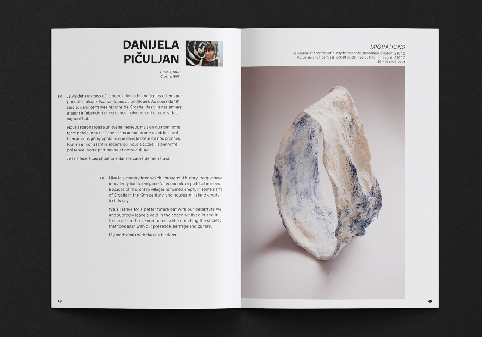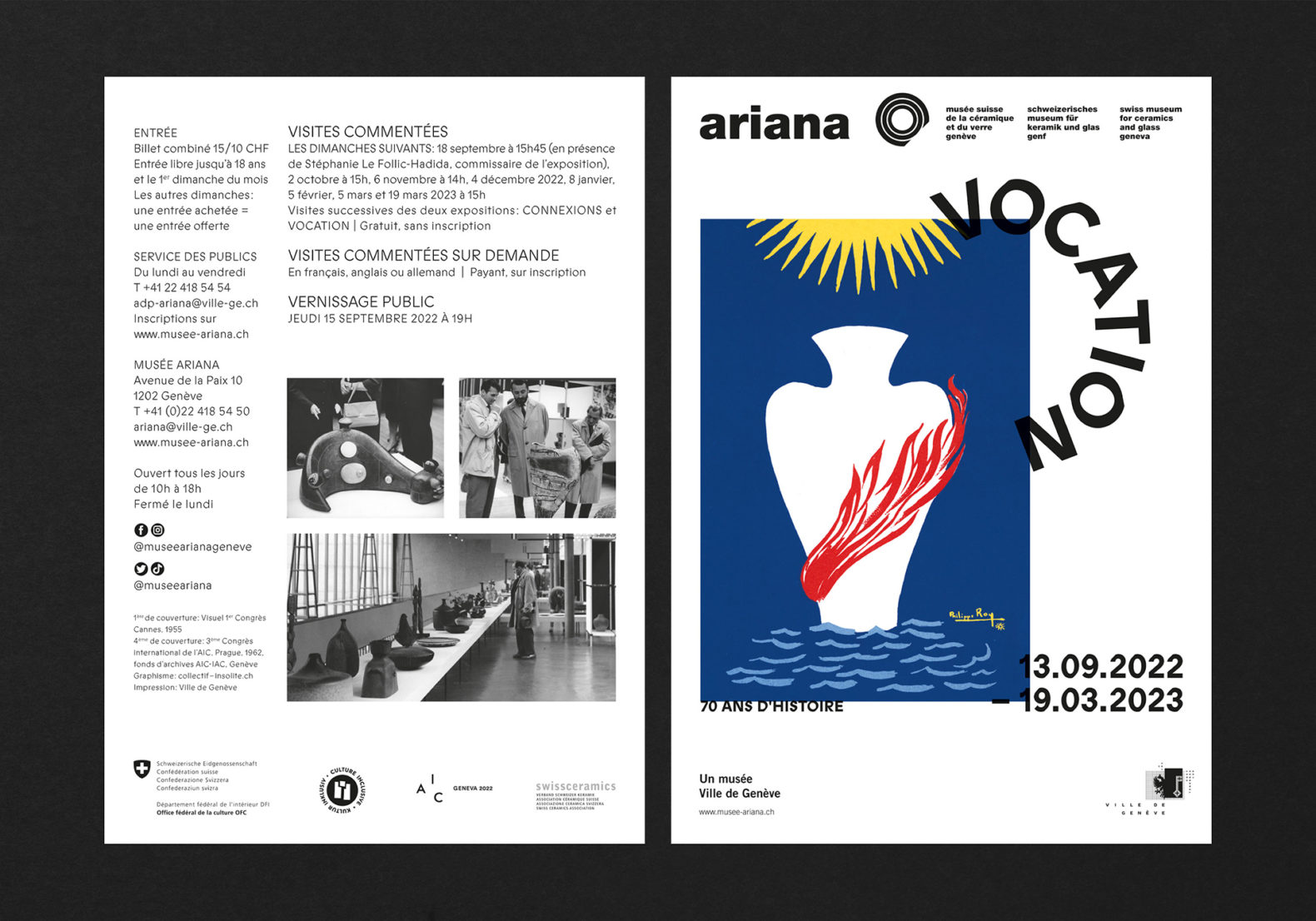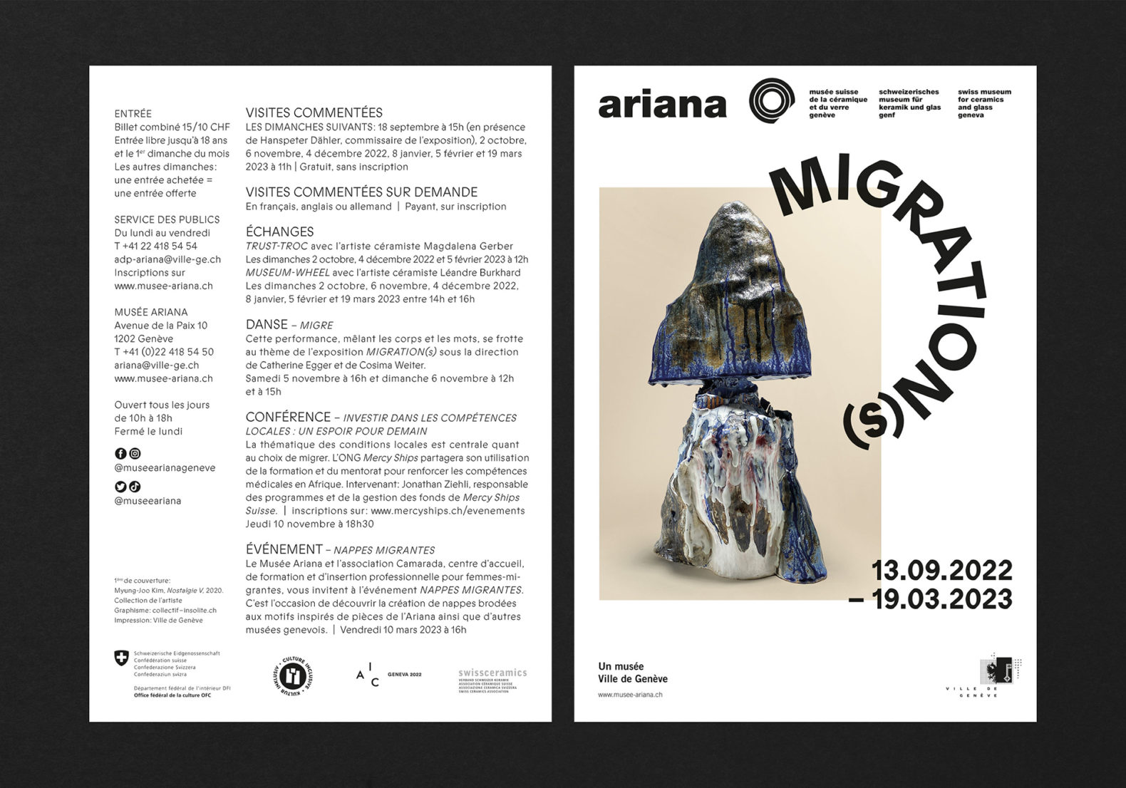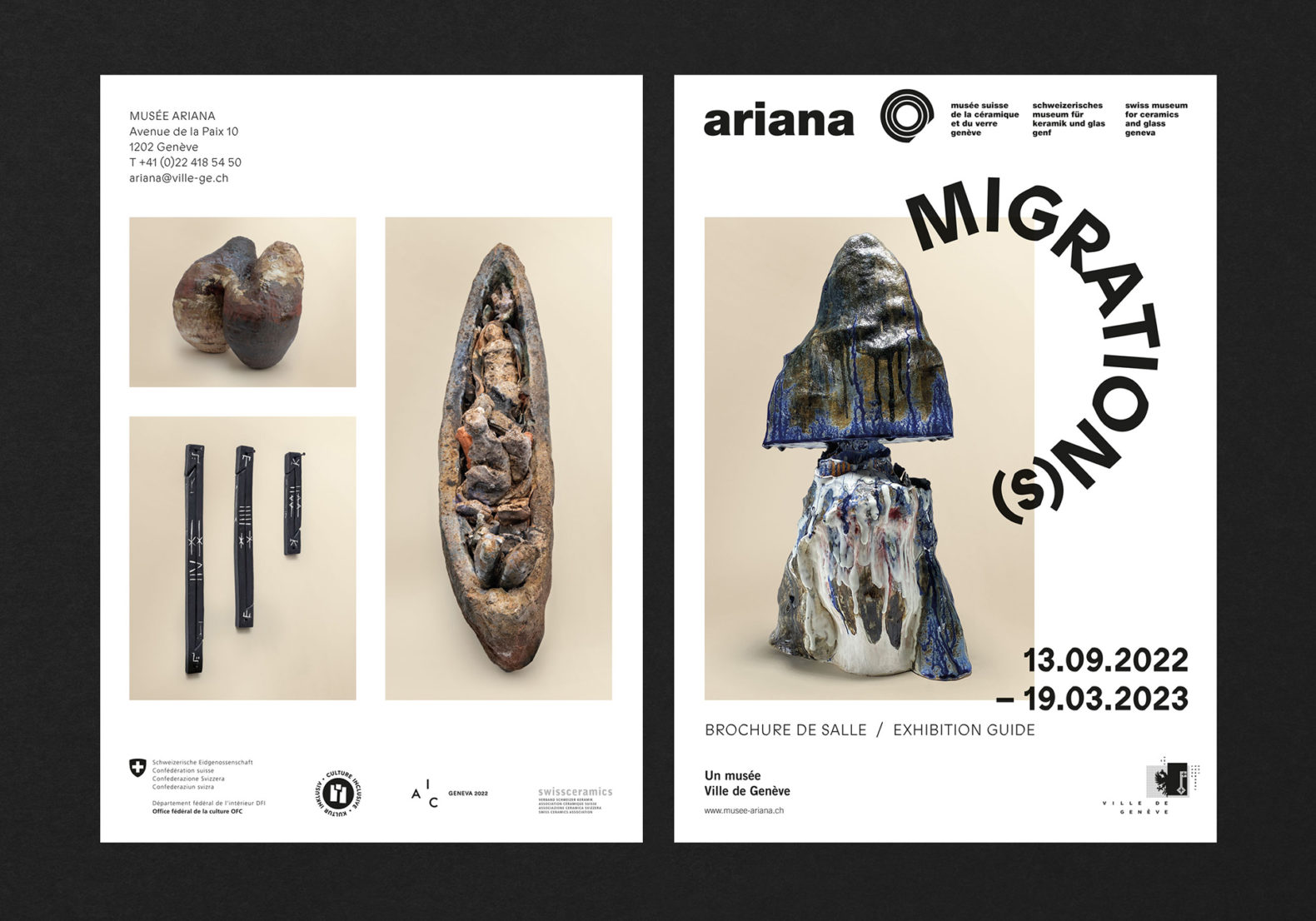 Nous avons réalisé une ligne graphique commune aux trois différentes expositions que sont Migration(s), Connexions et Vocation. Cette ligne graphique renvoie à la céramique contemporaine, à l’échange international et au partage. Nous avons choisi une image par exposition, en y ajoutant une couleur de fond. Les titres des expositions, inscrits en demi cercles, rappellent le voyage (tampons).