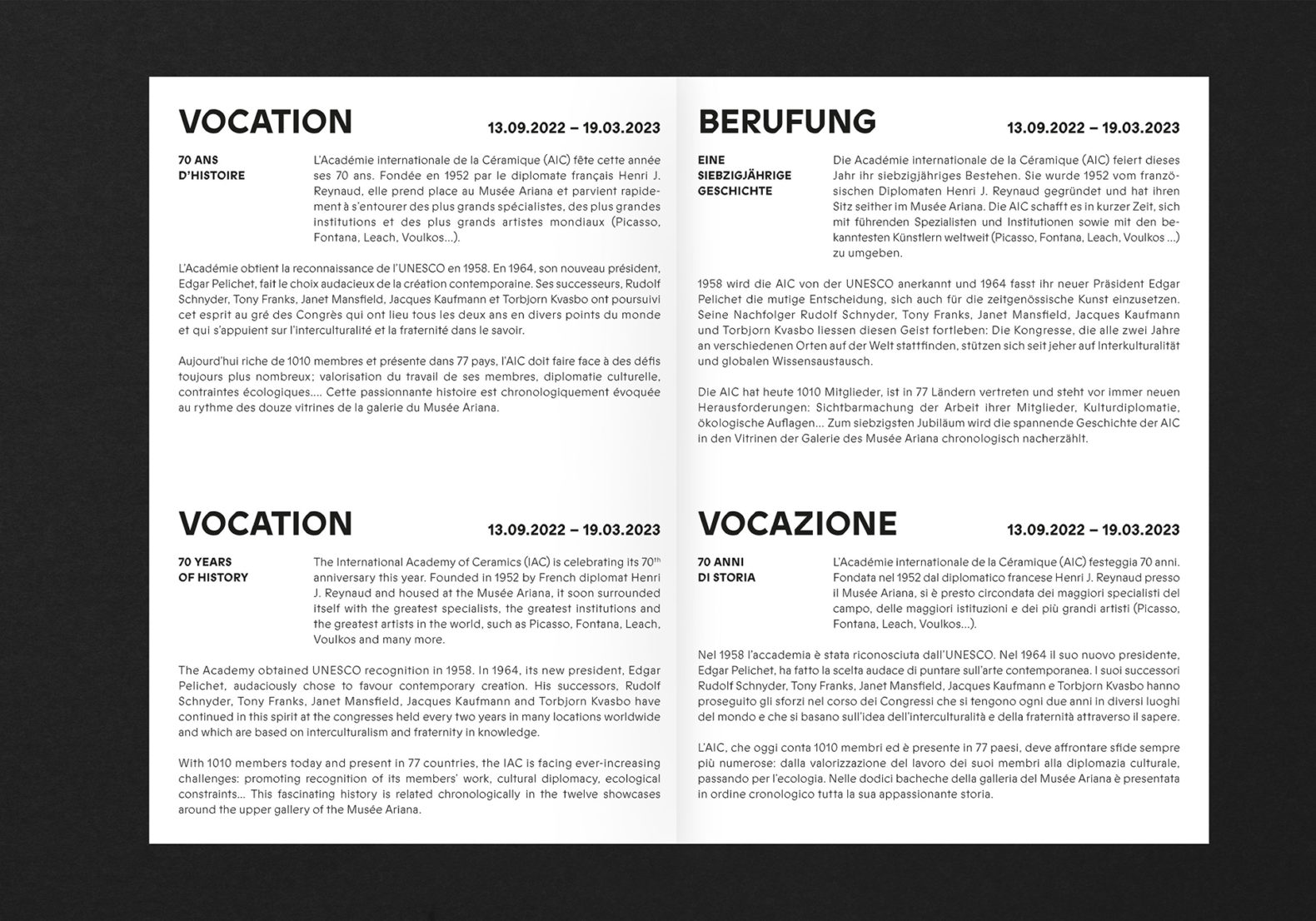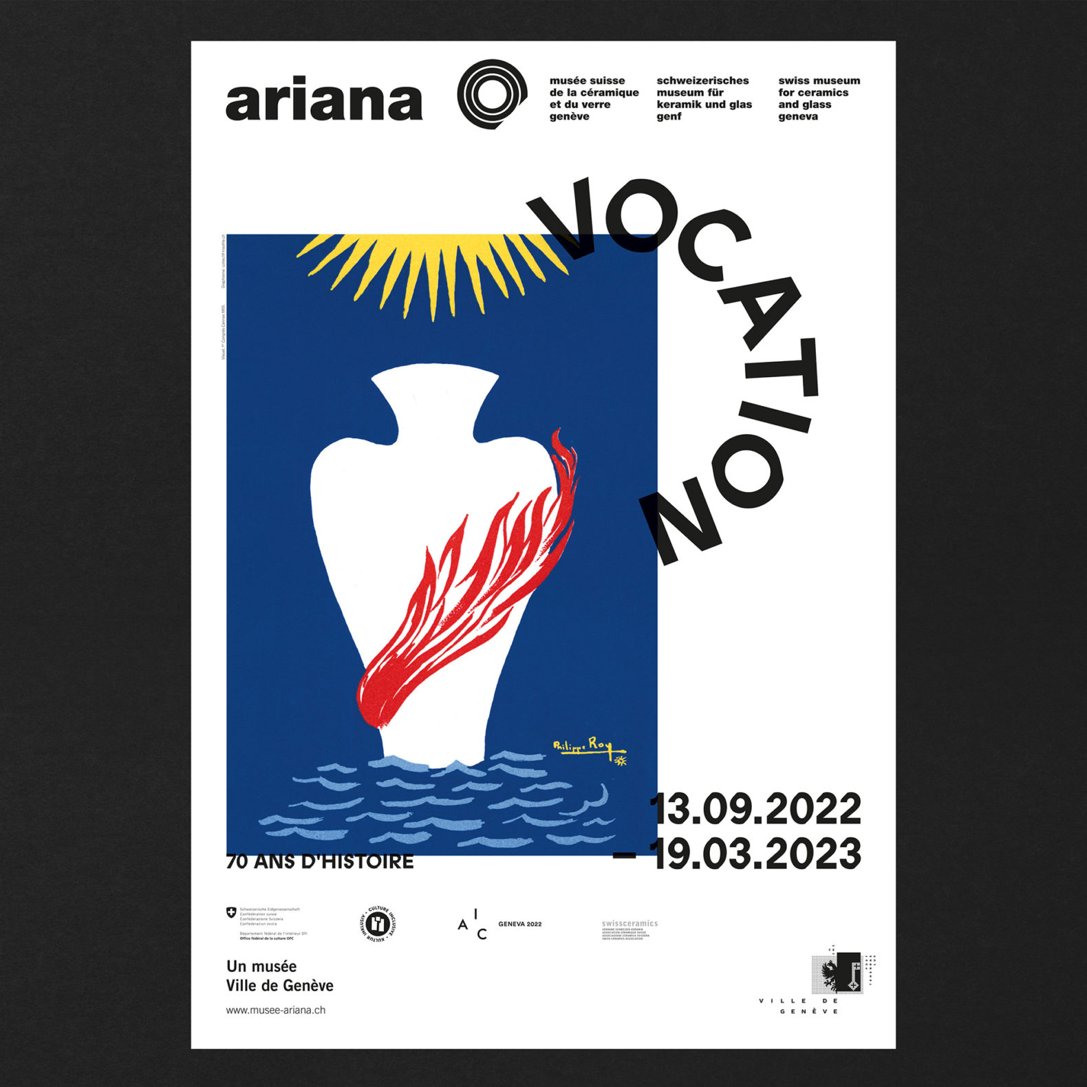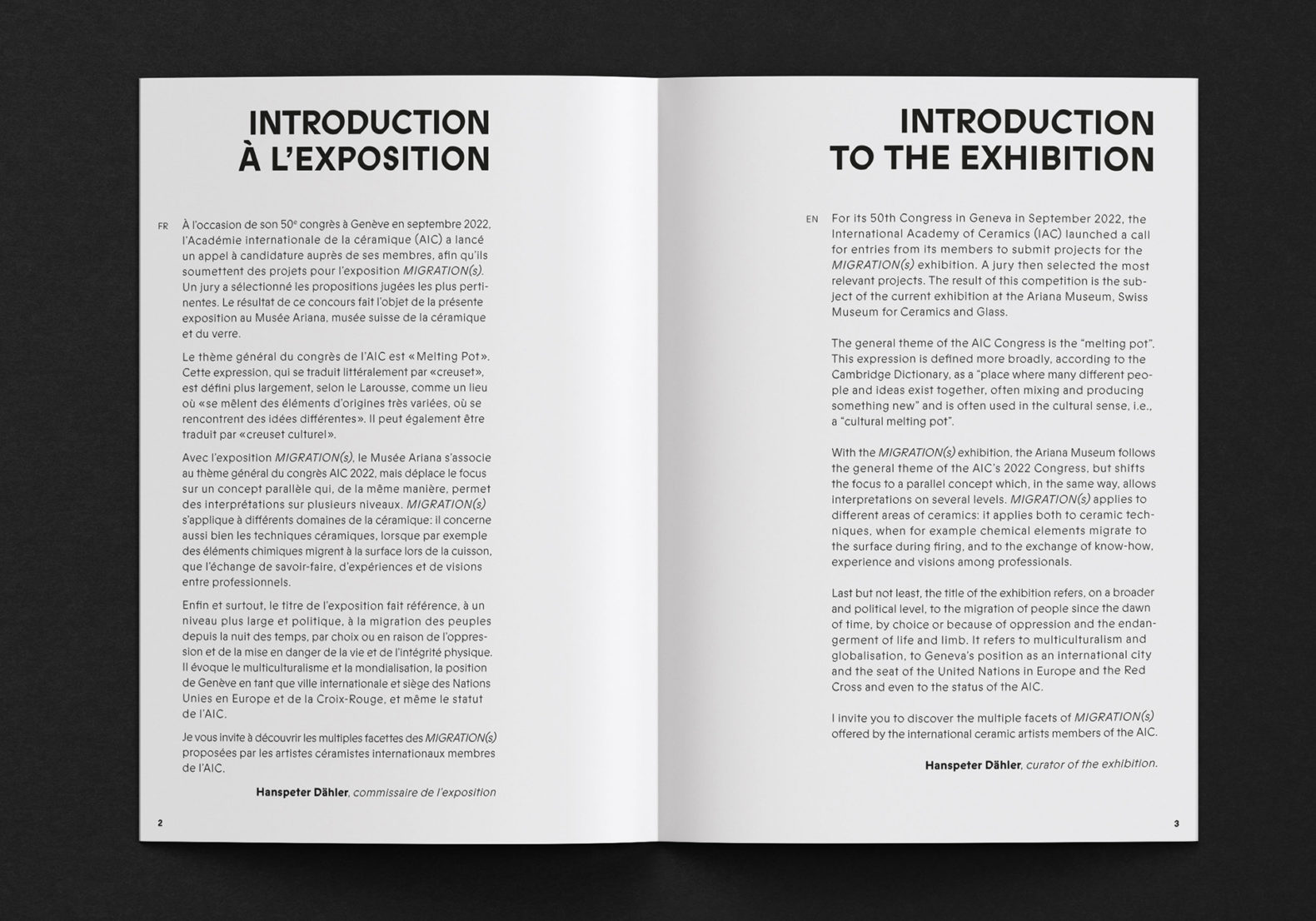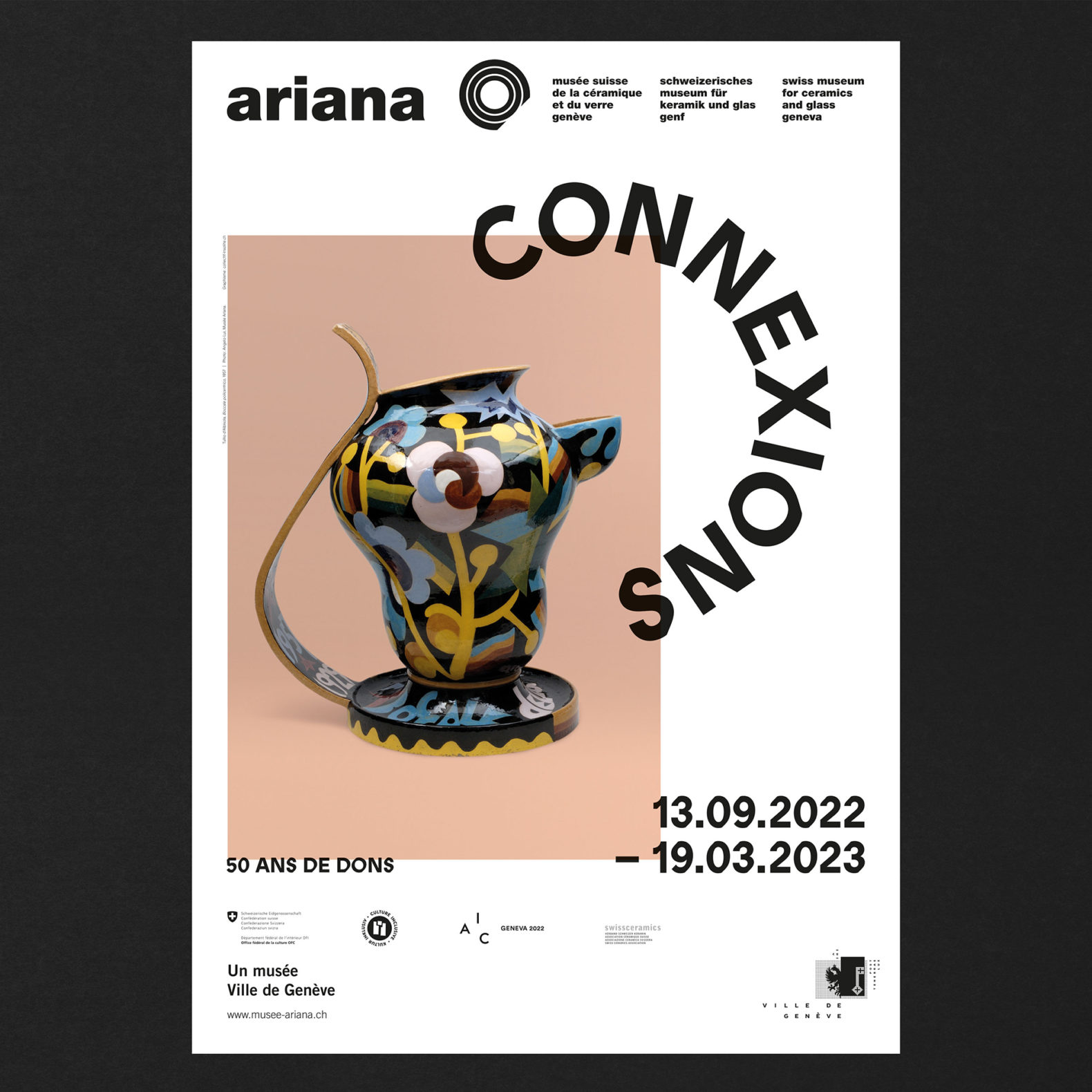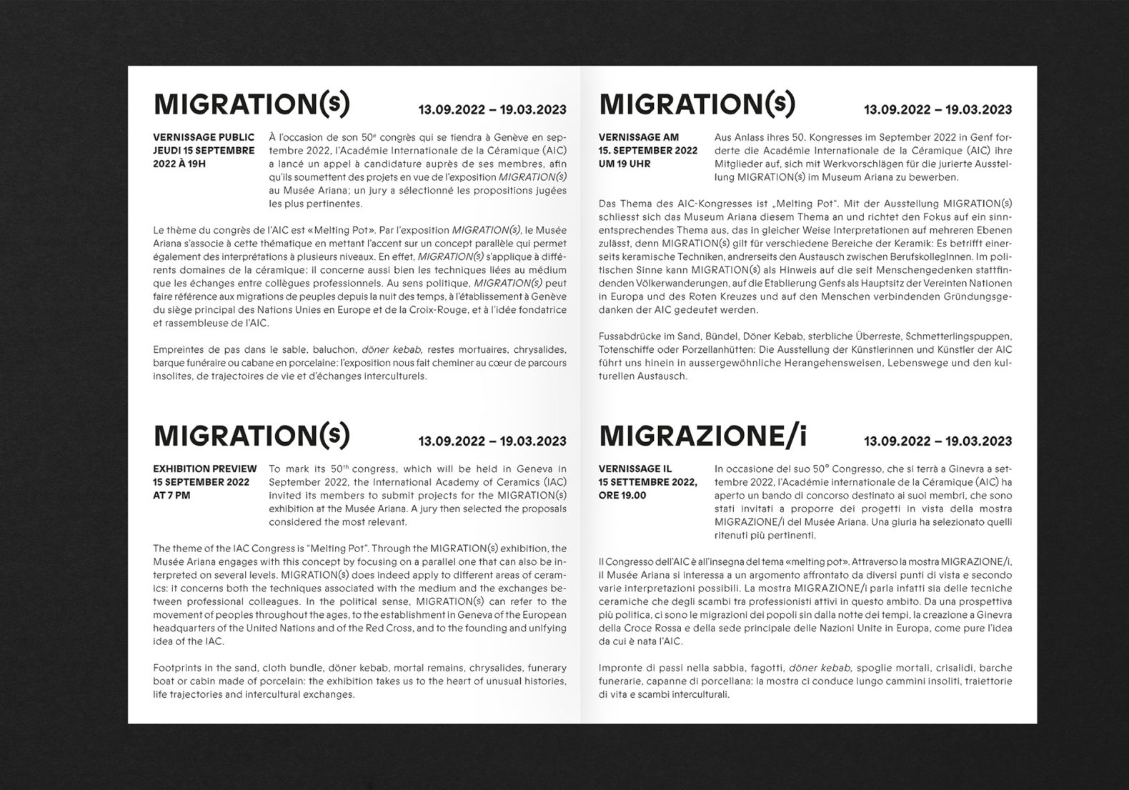 Nous avons réalisé une ligne graphique commune aux trois différentes expositions que sont Migration(s), Connexions et Vocation. Cette ligne graphique renvoie à la céramique contemporaine, à l’échange international et au partage. Nous avons choisi une image par exposition, en y ajoutant une couleur de fond. Les titres des expositions, inscrits en demi cercles, rappellent le voyage (tampons).