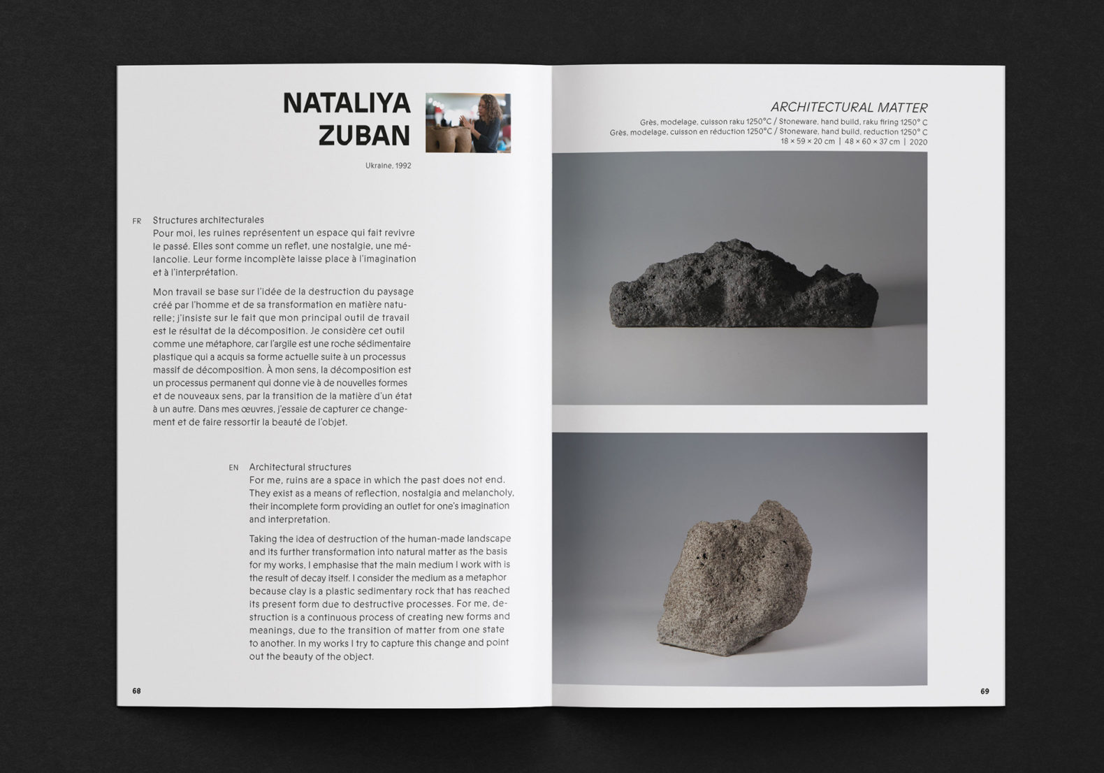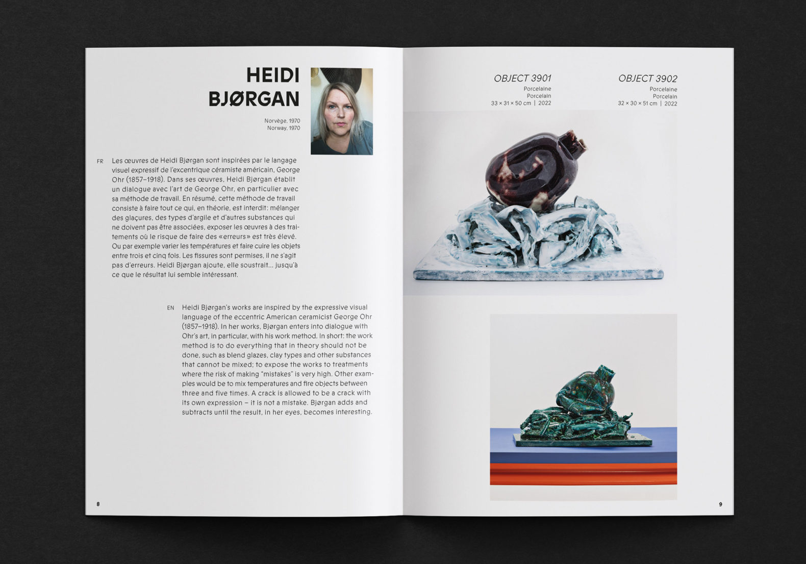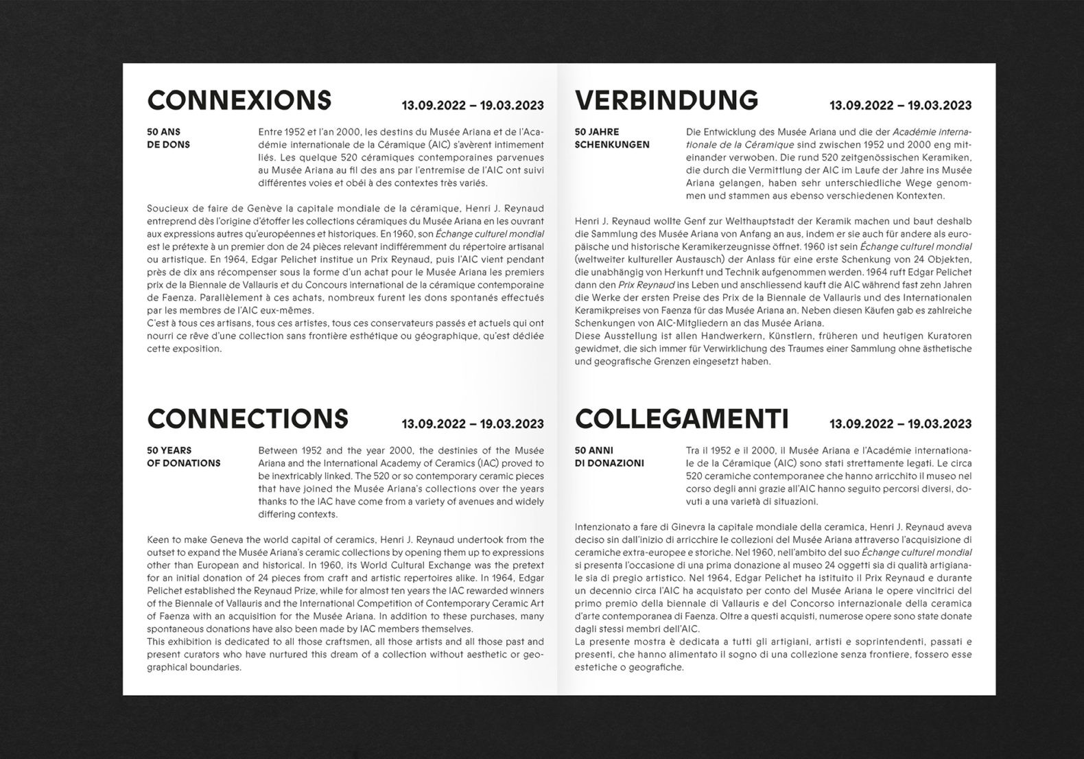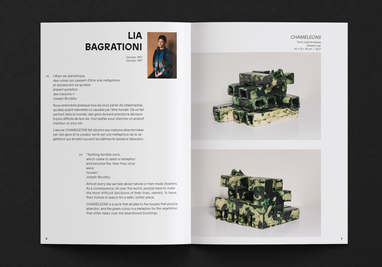 Nous avons réalisé une ligne graphique commune aux trois différentes expositions que sont Migration(s), Connexions et Vocation. Cette ligne graphique renvoie à la céramique contemporaine, à l’échange international et au partage. Nous avons choisi une image par exposition, en y ajoutant une couleur de fond. Les titres des expositions, inscrits en demi cercles, rappellent le voyage (tampons).