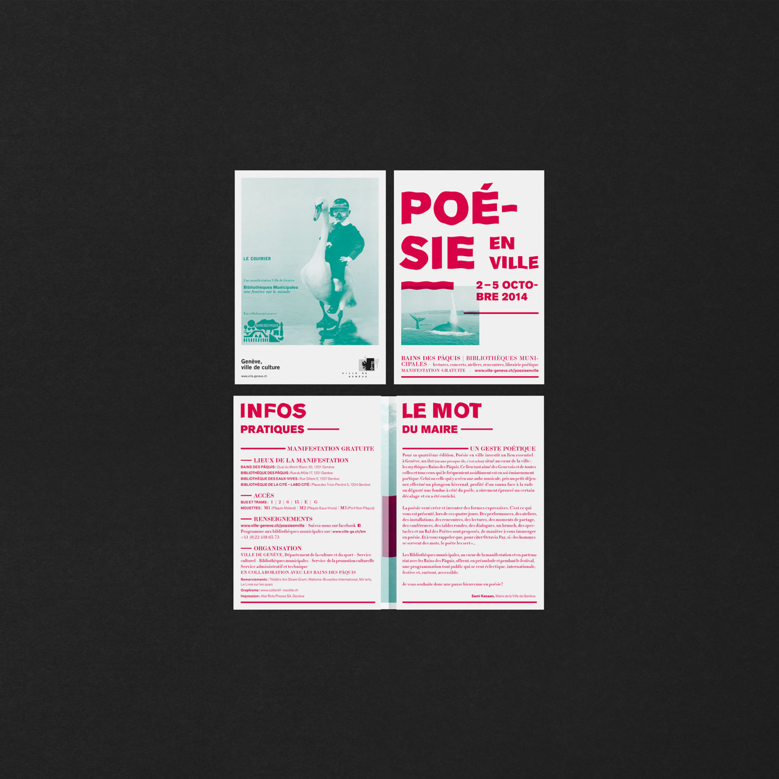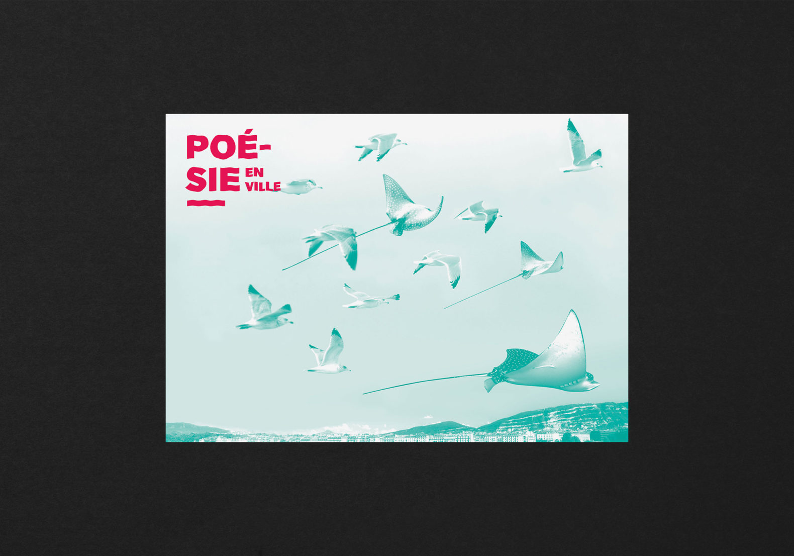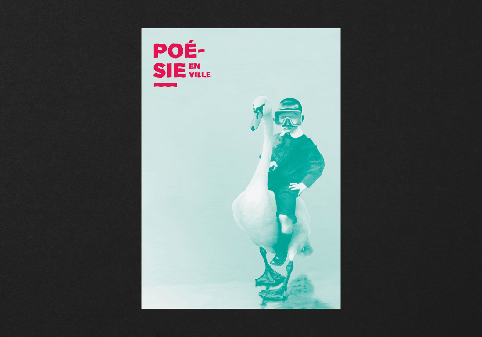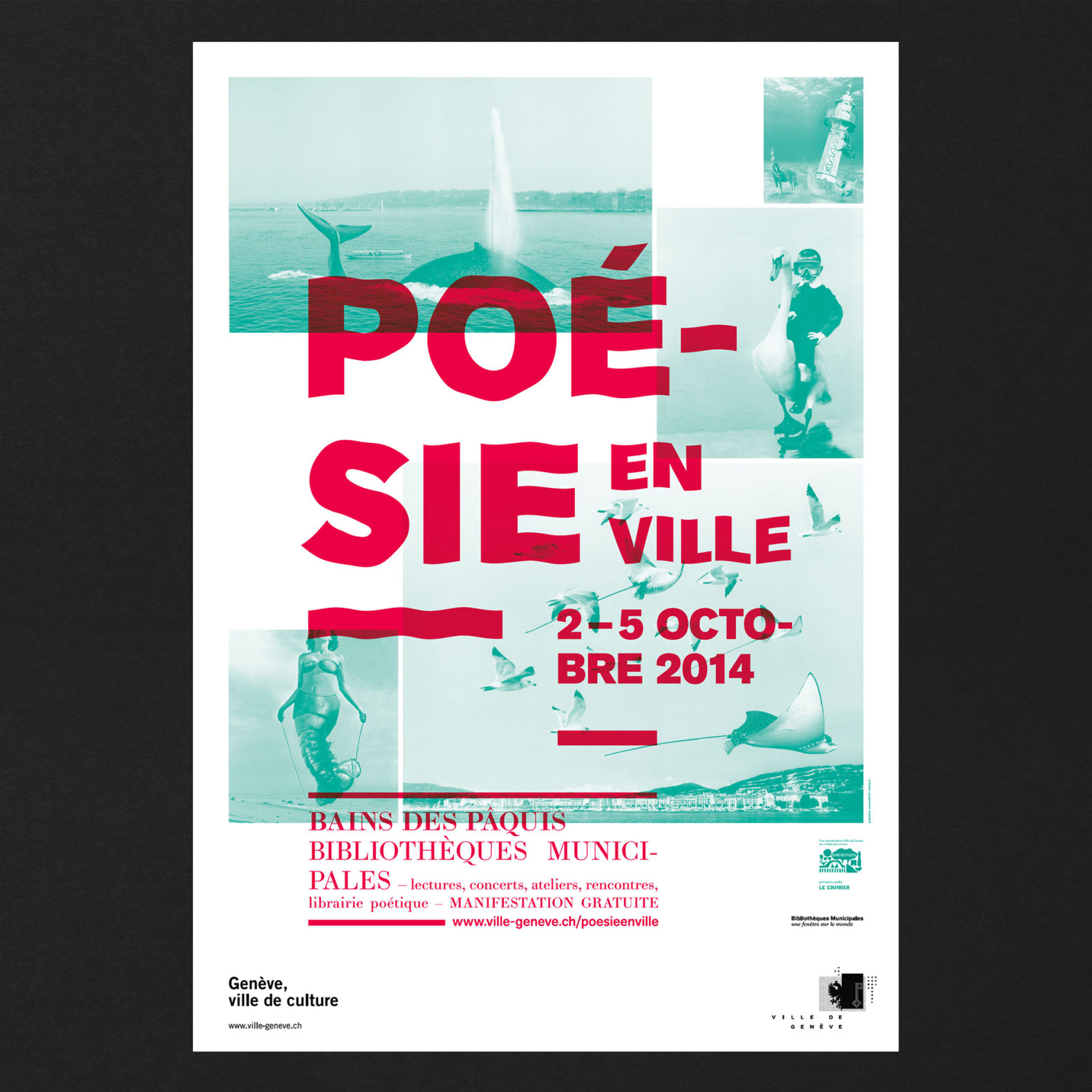 L’idée est de créer des histoires poétiques mettant en relation la population genevoise avec la poésie contemporaine qui, le temps d’un festival, vient rendre le quotidien et imaginatif, drôle et stimulant. Ces poèmes visuels sont composés de plusieurs images qui permettent de créer des histoires poétiques (plus ou moins probables). Les visuels sont décalés et permettent, grâce à cet humour, de percevoir la poésie comme quelque chose de léger et d’accessible. Nous avons déformé le lettrage du titre avec un effet d’ondulation. Cela renvoie également à l’environnement extérieur lacustre du siège du festival (Bains des Pâquis).