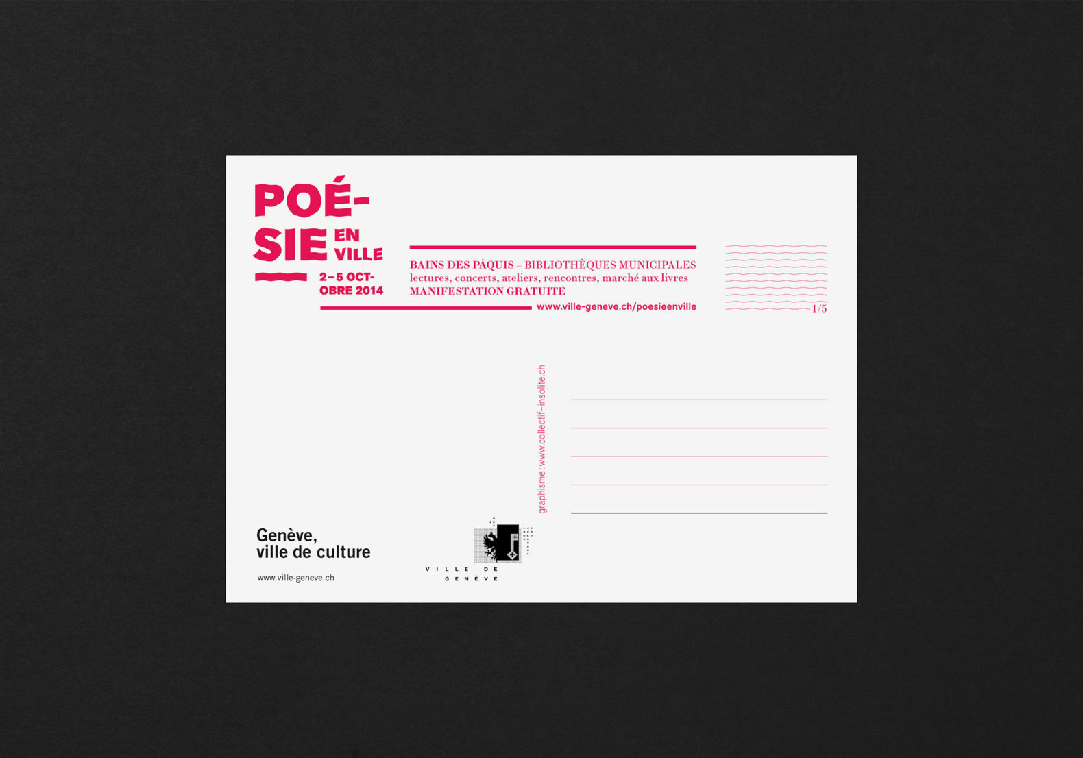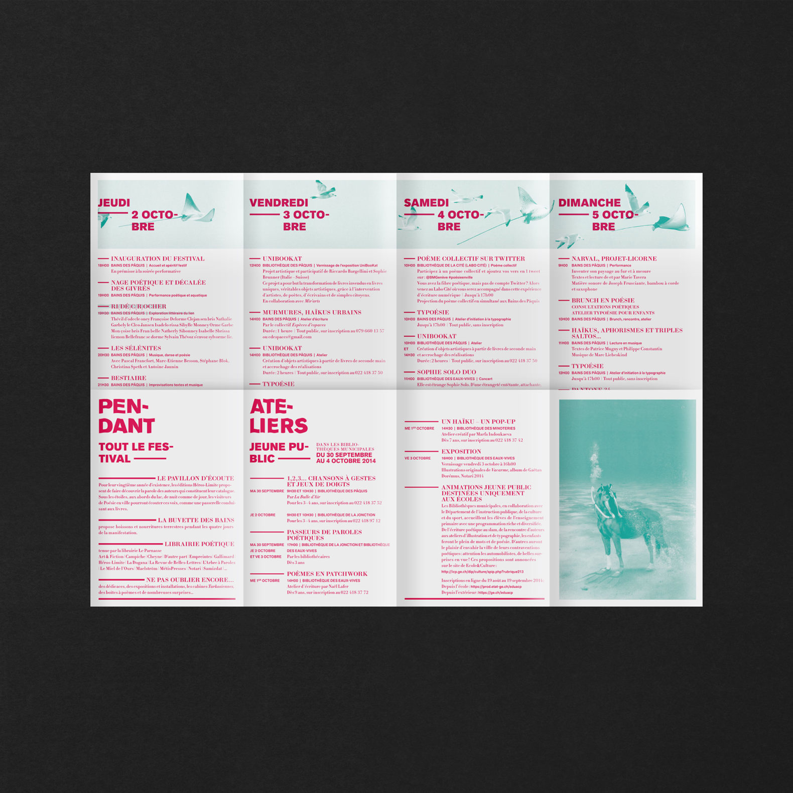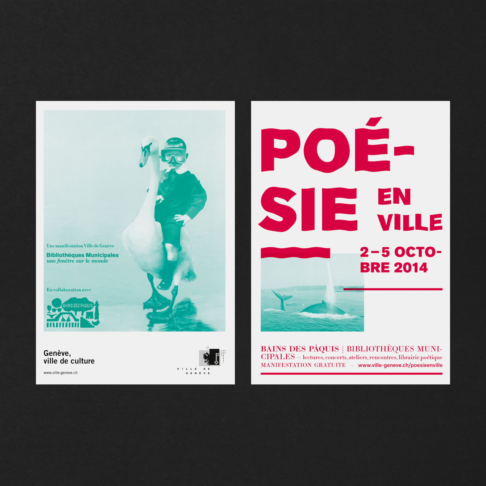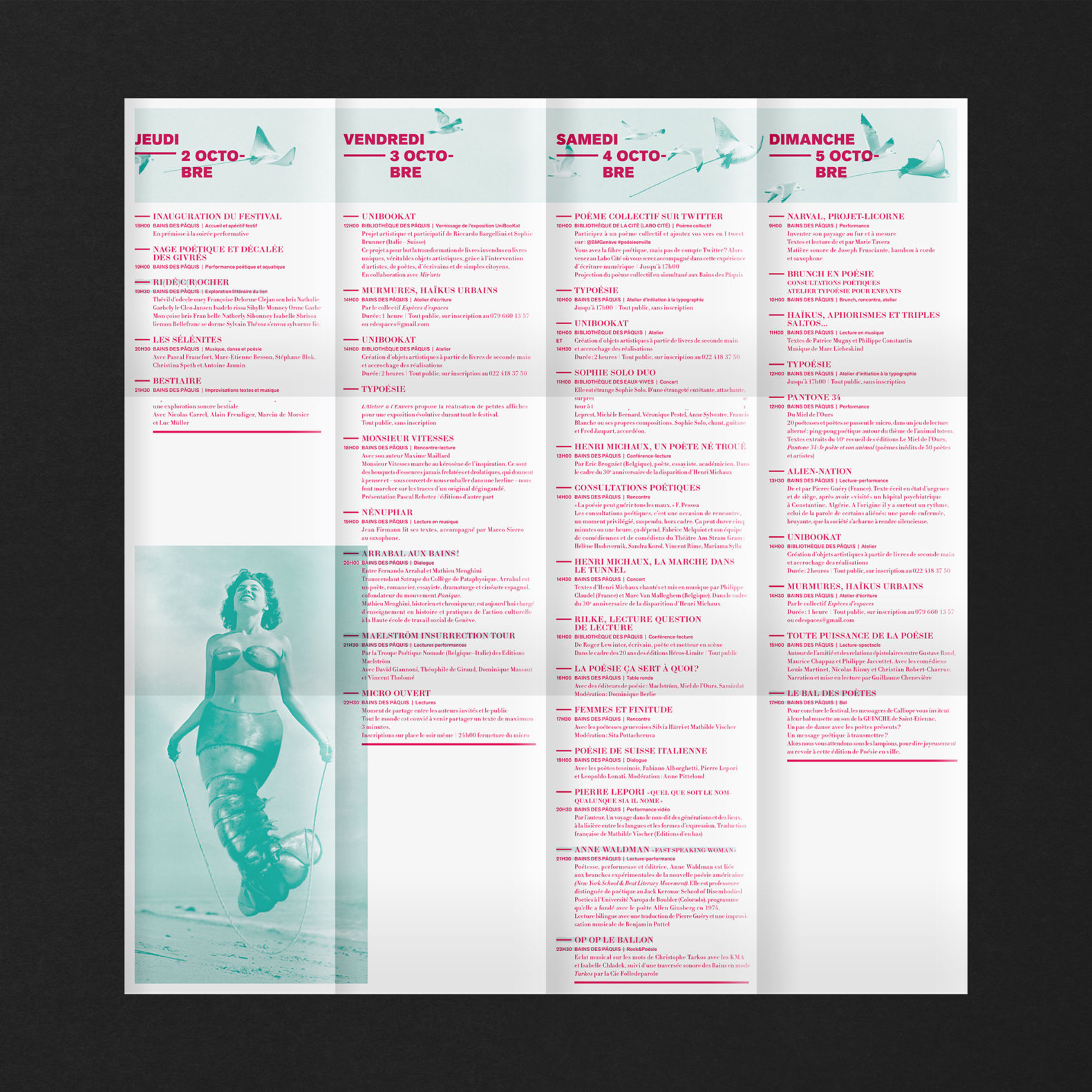 L’idée est de créer des histoires poétiques mettant en relation la population genevoise avec la poésie contemporaine qui, le temps d’un festival, vient rendre le quotidien et imaginatif, drôle et stimulant. Ces poèmes visuels sont composés de plusieurs images qui permettent de créer des histoires poétiques (plus ou moins probables). Les visuels sont décalés et permettent, grâce à cet humour, de percevoir la poésie comme quelque chose de léger et d’accessible. Nous avons déformé le lettrage du titre avec un effet d’ondulation. Cela renvoie également à l’environnement extérieur lacustre du siège du festival (Bains des Pâquis).