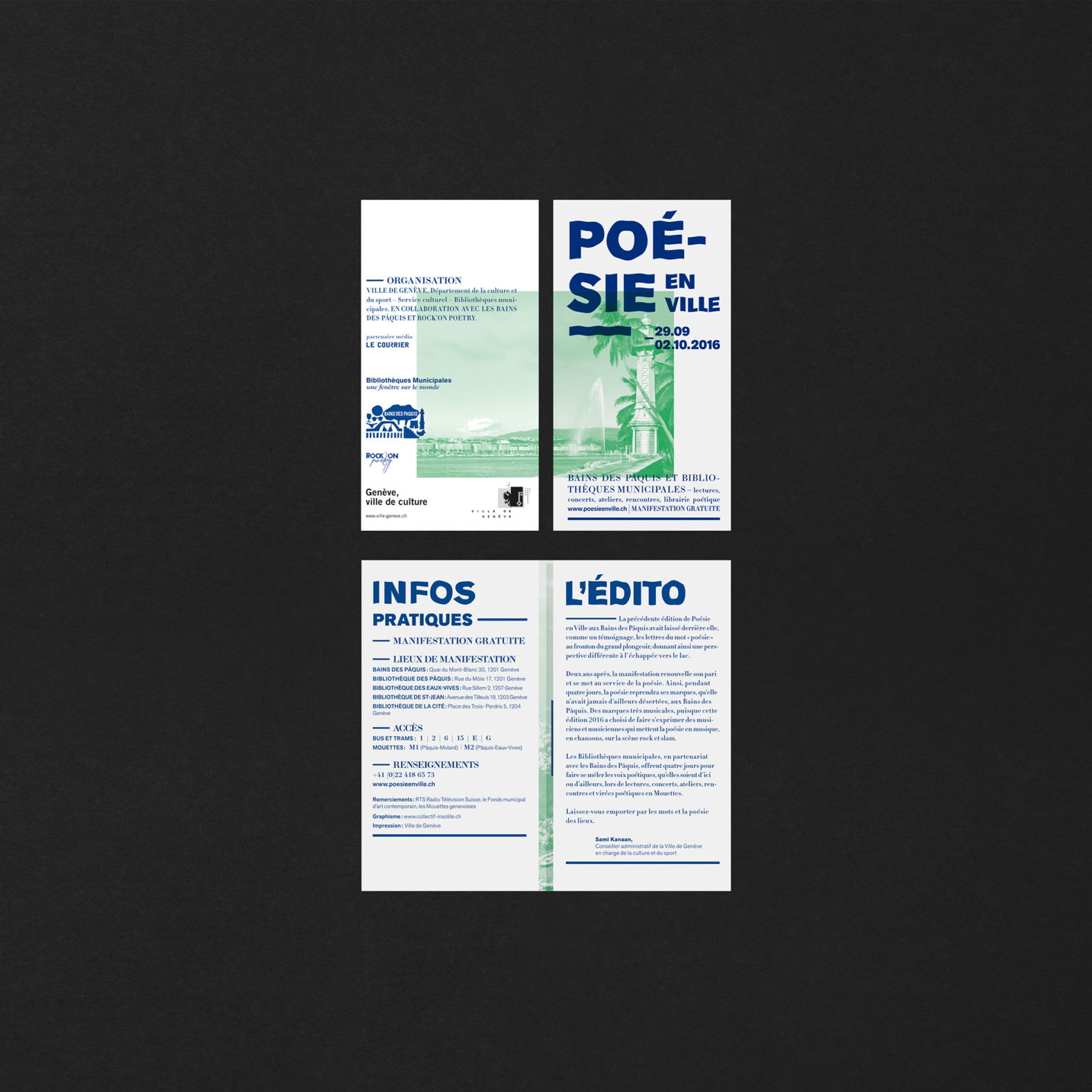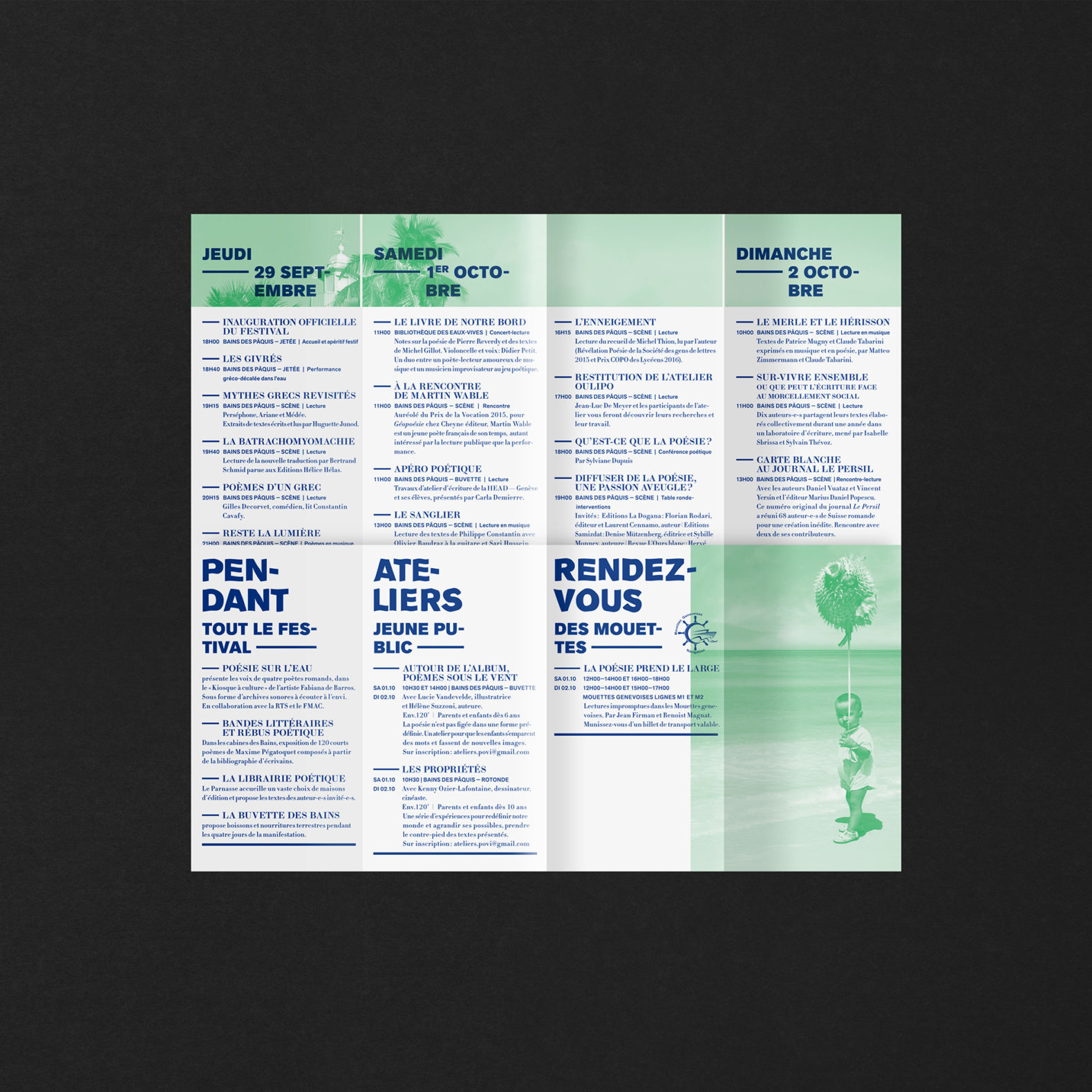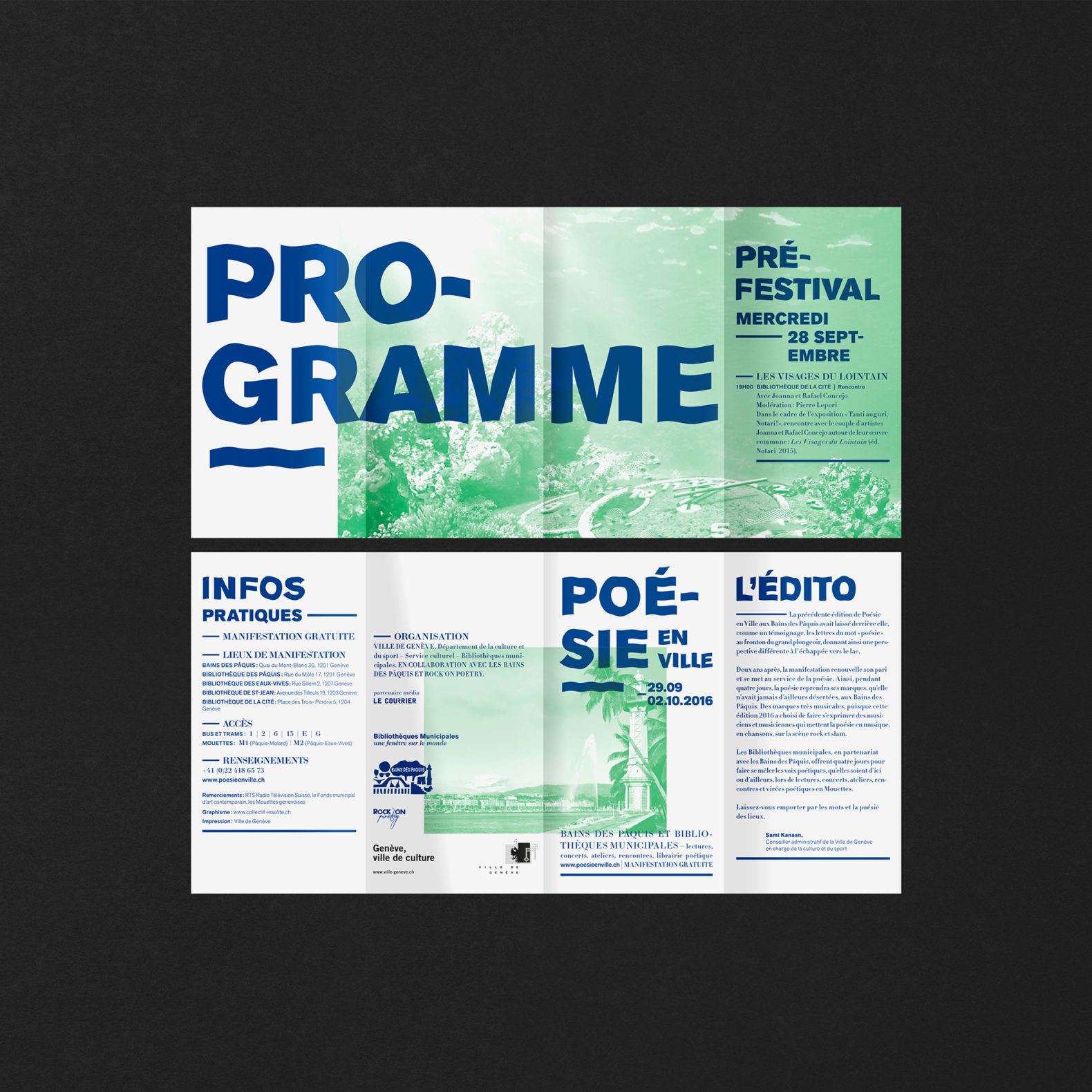 Nous avons repris la ligne graphique développée en 2014 pour permettre d’ancrer visuellement l’identité du festival. L’idée est toujours de créer des histoires poétiques qui mettent en relation la population genevoise avec la poésie contemporaine. Ces poèmes visuels sont composés de plusieurs images découpées et recollées ensemble pour créer des histoires poétiques et décalées.
