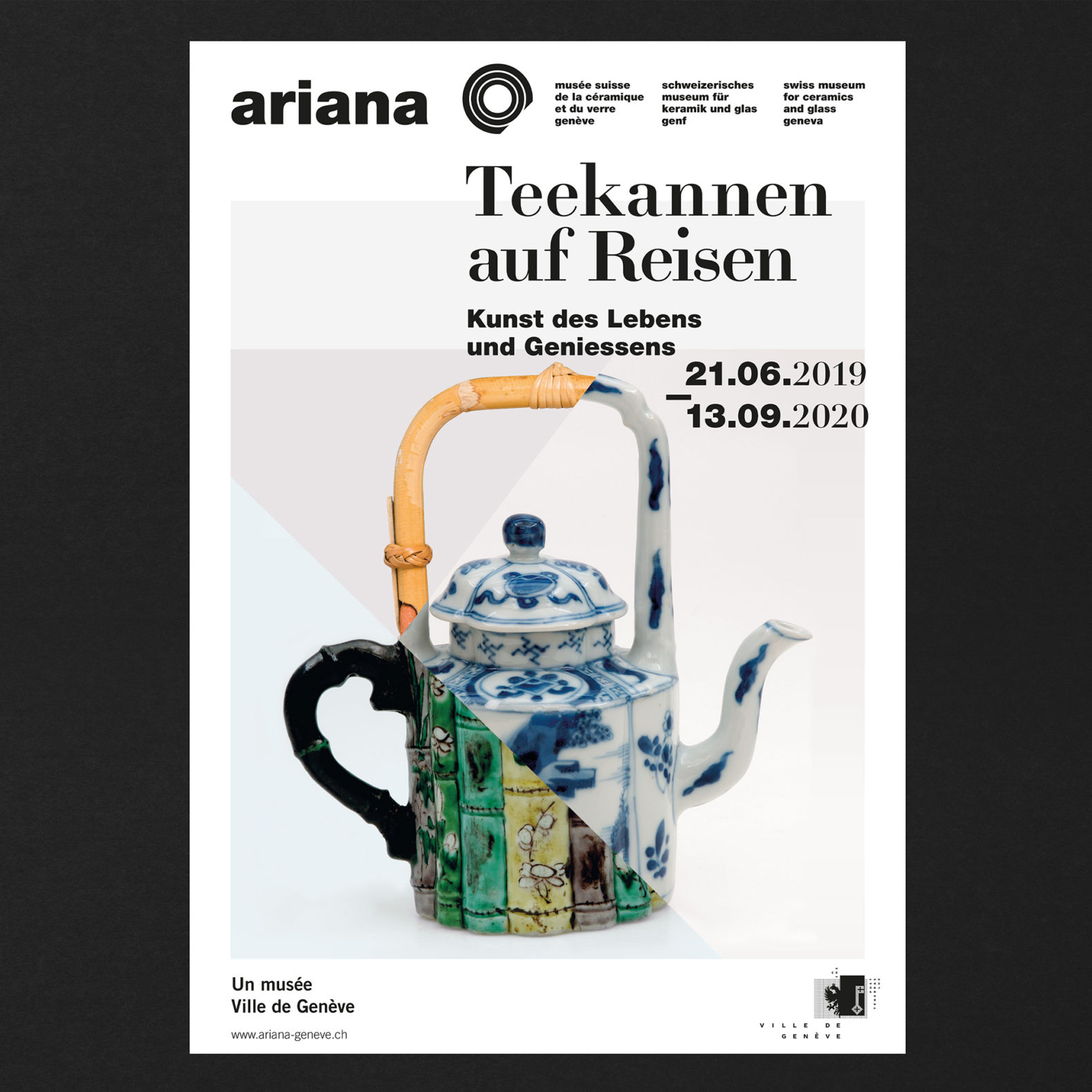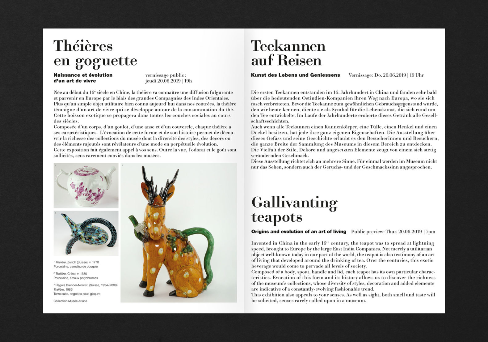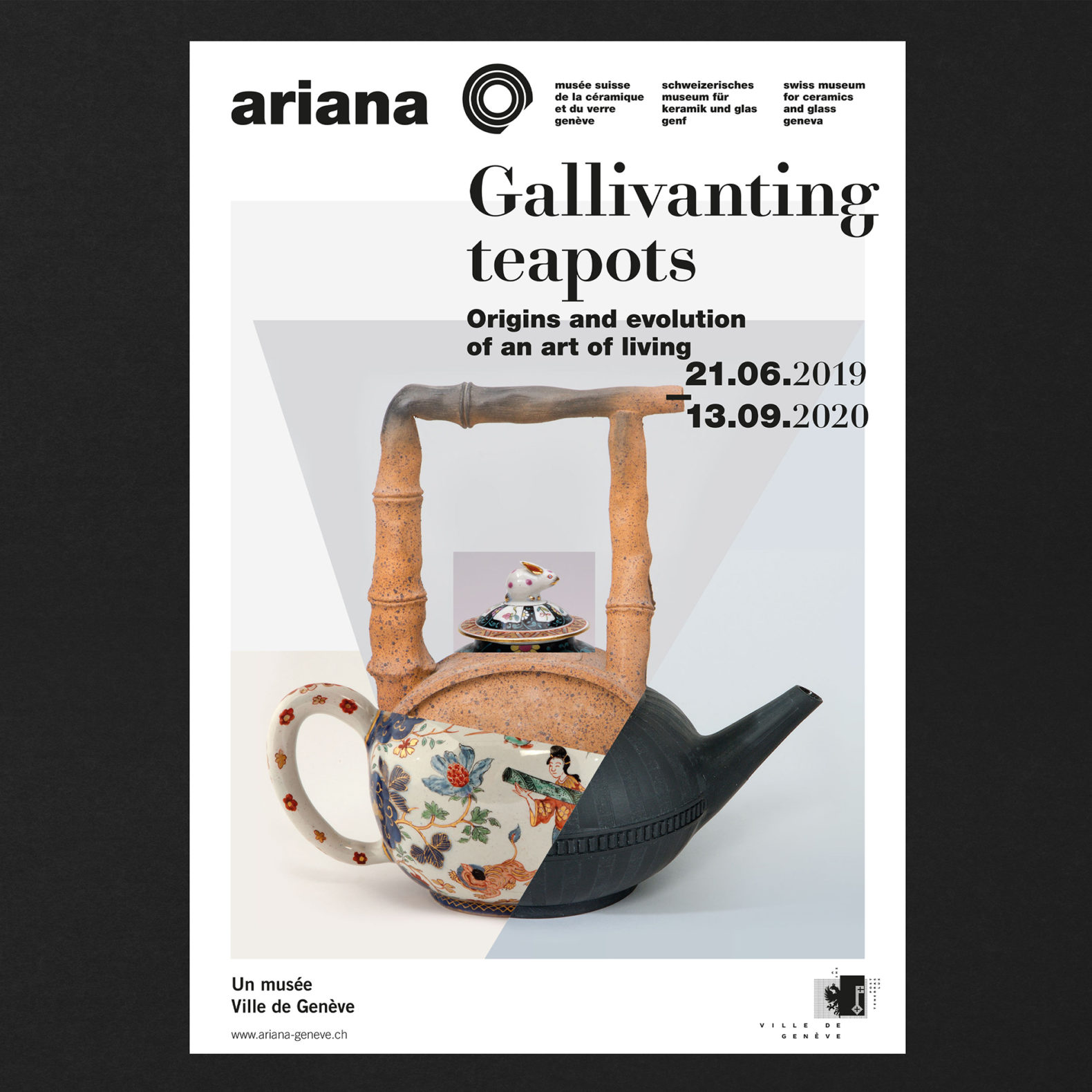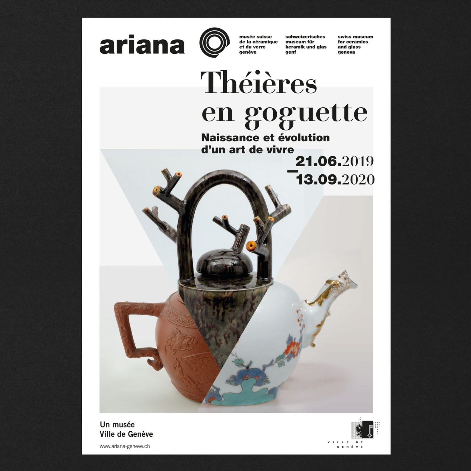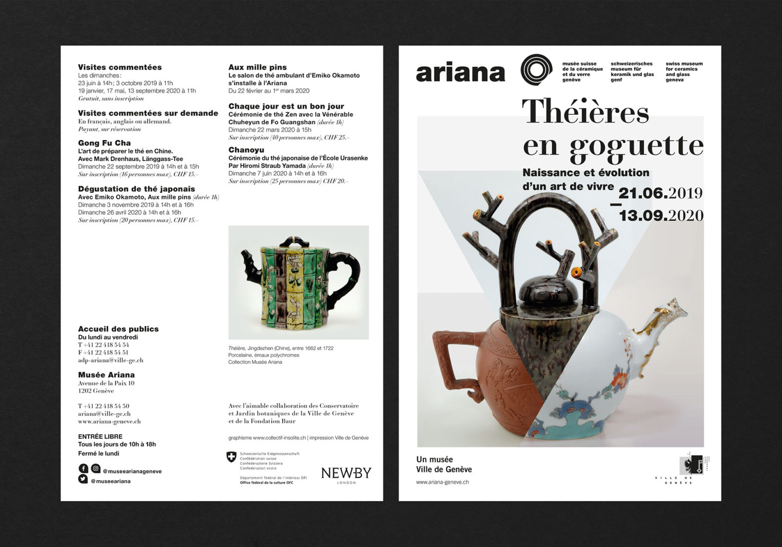 Pour intégrer cette diversité de styles, de formes, de matériaux, de couleurs et de taille dans la communication de l’événement, nous avons opté pour un montage composé de plusieurs morceaux de théières. Ce collage, visible grâce aux fonds colorés, permet de recomposer une théière et de créer un visuel à part entière. Nous avons réalisé trois montages de théières pour les brochures d’exposition disponibles en trois langues.