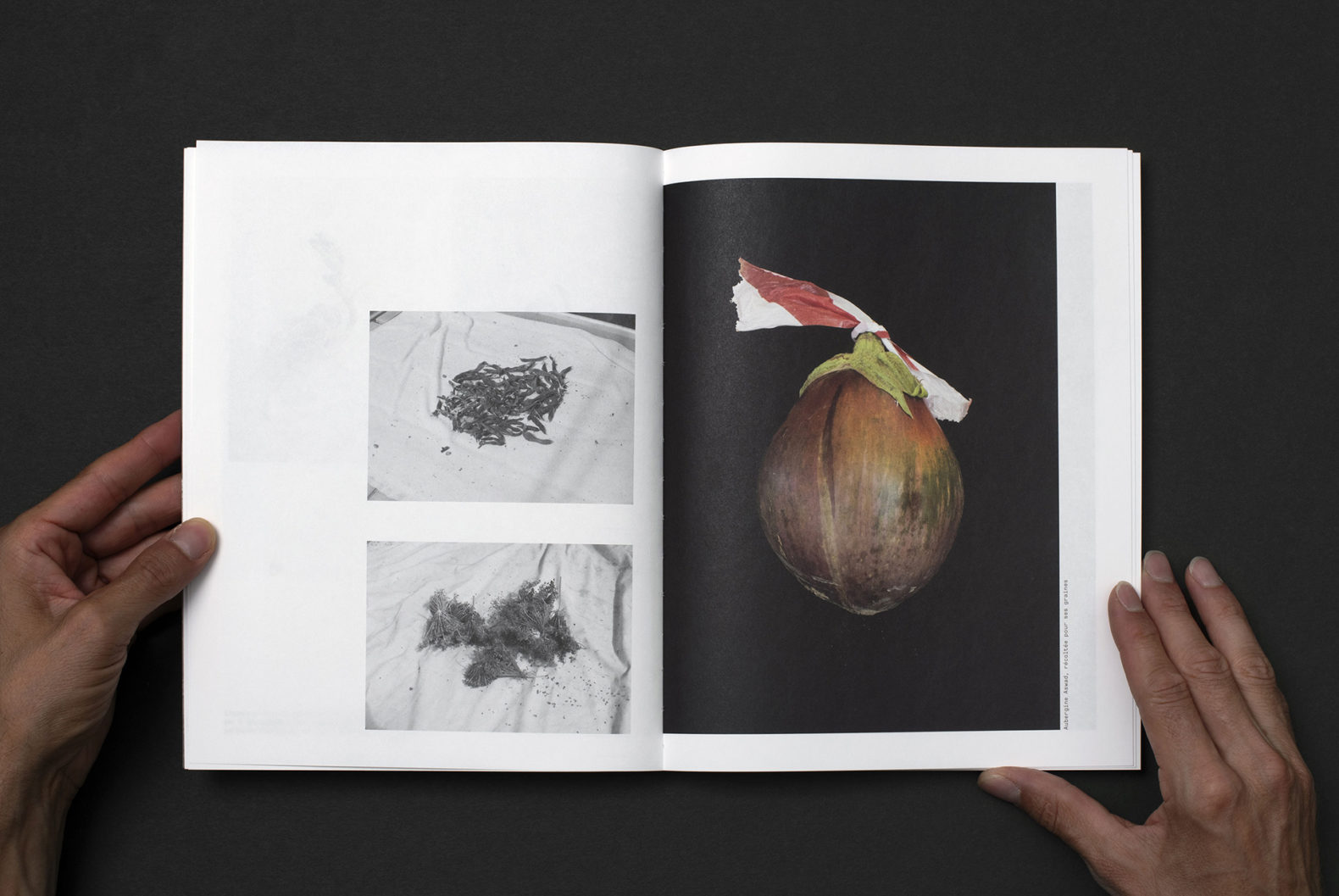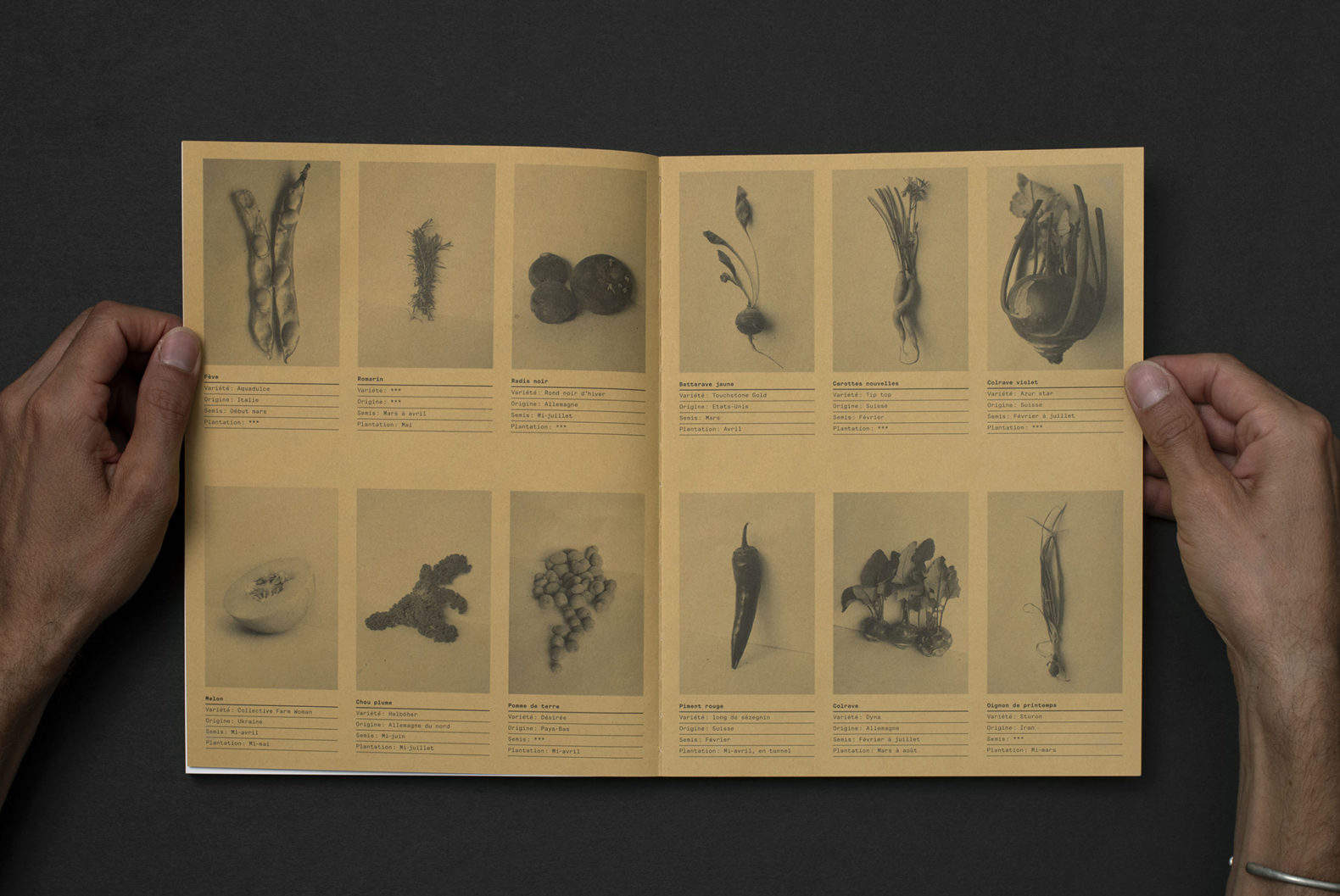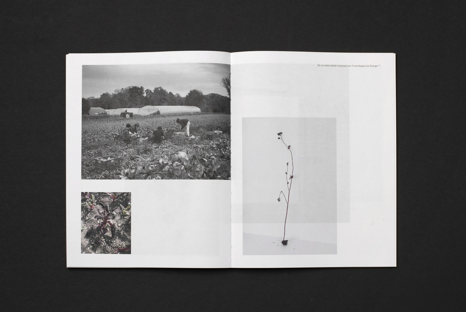 Le livre TINA (?) est composé d’une première partie mettant en page le magnifique travail de photographie de Yann. La mise en page est rythmée et variée pour représenter ce mode d’agriculture alternatif qui est multiforme et vivant. La seconde partie est un catalogue qui compare de façon méthodique les légumes issus de l’agriculture alternative et ceux issus des supermarchés. Les images sont présentées de manière répertoriées. Le changement de type de papier marque également la différenciation entre les deux parties du livre.