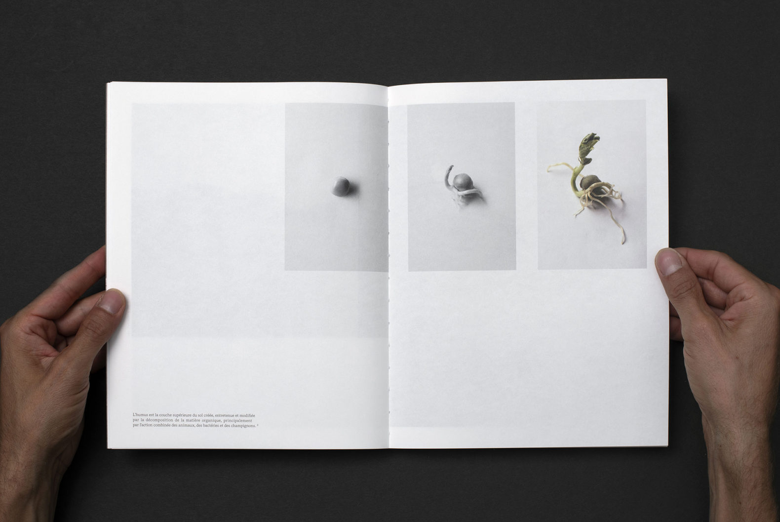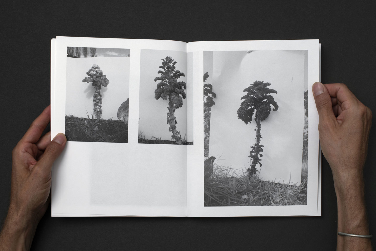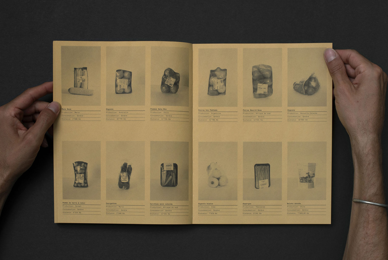 Le livre TINA (?) est composé d’une première partie mettant en page le magnifique travail de photographie de Yann. La mise en page est rythmée et variée pour représenter ce mode d’agriculture alternatif qui est multiforme et vivant. La seconde partie est un catalogue qui compare de façon méthodique les légumes issus de l’agriculture alternative et ceux issus des supermarchés. Les images sont présentées de manière répertoriées. Le changement de type de papier marque également la différenciation entre les deux parties du livre.